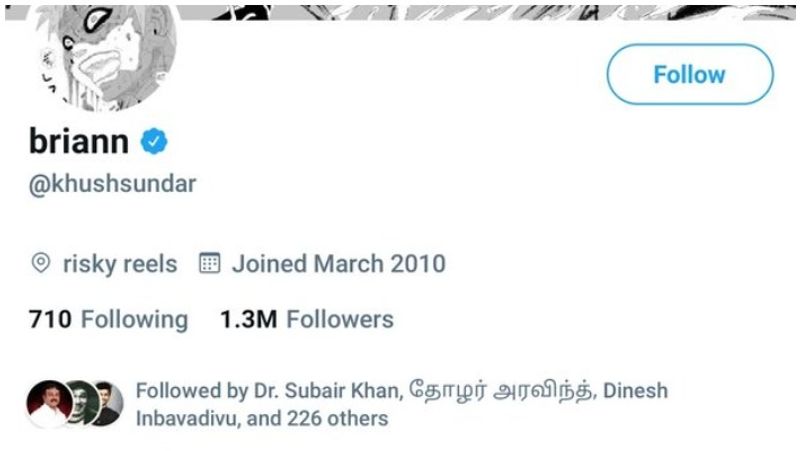 பாஜக நிர்வாகியான நடிகை குஷ்பு ட்விட்டர் வலைதளத்தில் கரசாரமான அரசிய்ல் பதிவுகளை வெளியிட்டு வந்தார். அவை பல சமயங்களில் பேசுபொருளாக, விவாதகளமாக அமைந்துள்ளது. இந்நிலையில் குஷ்புவின் ட்விட்டர் அக்கவுண்ட் முடக்கப்பட்டு, அதில் இருந்த பதிவுகள் அனைத்தும் நீக்கப்பட்டுள்ளன. குஷ்புவை ட்விட்டர் பக்கத்தில் 13 லட்சம் பேர் தொடர்ந்து வந்தனர். அவர் 710 பேரை தொடர்ந்து வருகிறார். இந்நிலையில் அவரது ஐடி முடக்கப்பட்டு @khushsundar என்பதற்கு பதிலாக briann என்கிற பெயரில் உள்ளது. அதன் பிறகு பின்னூட்டம் எதும் இடம்பெறவில்லை.