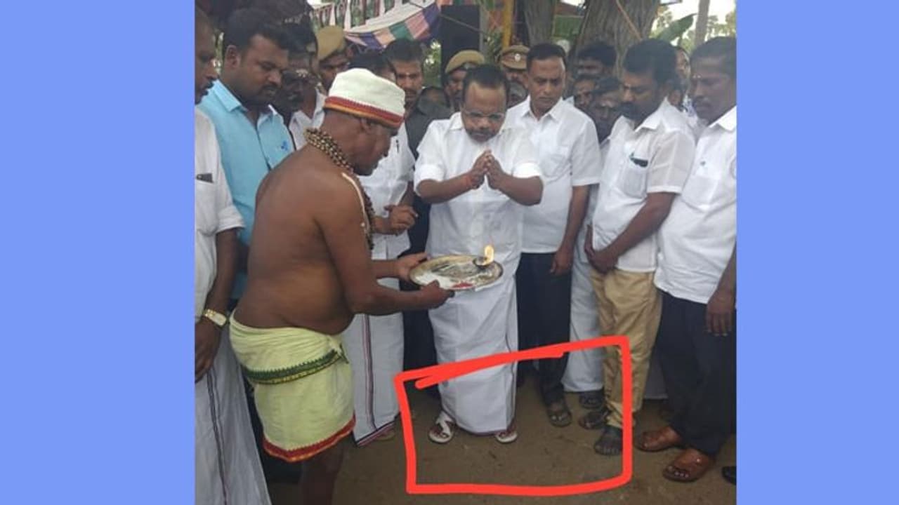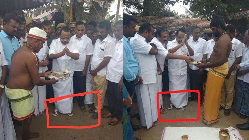 சபாநாயகர் தனபால் செருப்பு போட்டுக்கொண்டே பூமி பூஜையின் போது சாமி கும்பிட்டது பெரும் சர்ச்சையை ஏற்படுத்தி உள்ளது.