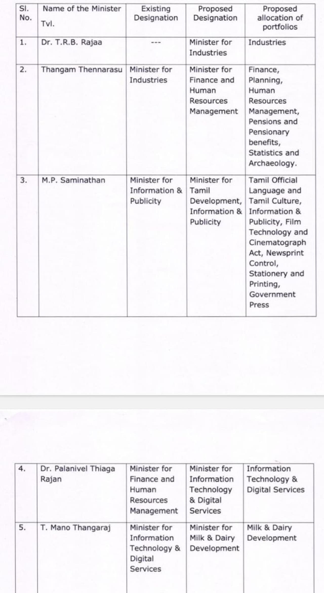 நிதி அமைச்சராக தங்கம் தென்னரசுவும், தொழில்துறை அமைச்சராக டிஆர்பி ராஜாவும் நியமிக்கப்பட்டுள்ளனர். மேலும் வெள்ளக்கோயில் சாமிநாதனுக்கு தமிழ் வளர்ச்சி துறை கூடுதலாக ஒதுக்கப்பட்டுள்ளது. பால்வளத்துறை அமைச்சராக மனோ தங்கராஜ் நியமிக்கப்பட்டுள்ளார். உதயநிதி மற்றும் சபரீசன் தொடர்பாக அமைச்சர் பிடிஆர் பேசியாக ஆடியோ வெளியான நிலையில் தற்போது நிதி அமைச்சர் பொறுப்பில் இருந்து தகவல் தொழில்நுட்ப அமைச்சராக மாற்றம் செய்யப்பட்டுள்ளார்.