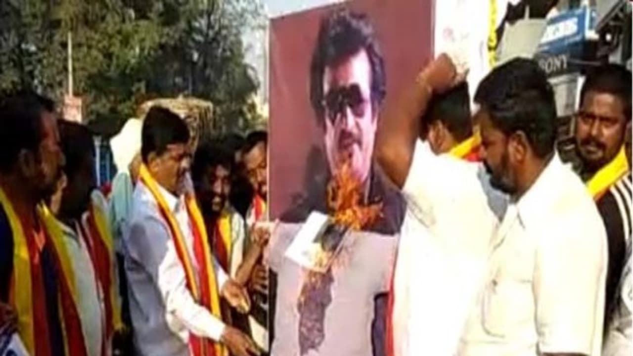 ரஜினியின் கருத்துக்கு எதிர்ப்பு தெரிவித்து,ரஜினியின் உருவ பொம்மையை கன்னட அமைப்பினர் எரித்து போராட்டத்தில் ஈடுபட்டனர்