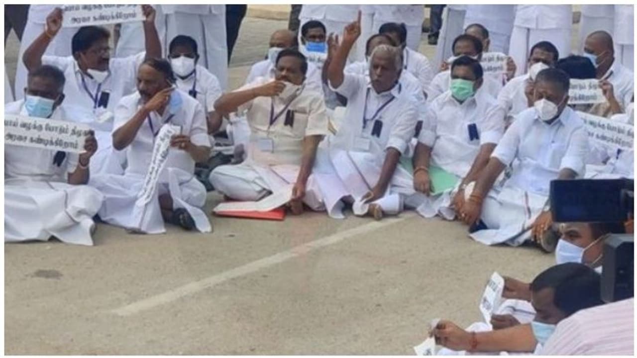 கோடநாடு வழக்கில் முதல்வரின் கேலிப் பேச்சினை கண்டித்தும் கவண ஈர்ப்பு தீர்மானத்தின் மீது பேச அனுமதி அளிக்காததை கண்டித்தும் அதிமுக, பாமக, பாஜக உறுப்பினர்கள் தமிழ்நாடு சட்டப்பேரவையில் இருந்து வெளிநடப்பு செய்தனர். பின்னர், எதிர்க்கட்சித் தலைவர் எடப்பாடி பழனிசாமி தலைமையில் அதிமுக சட்டமன்ற உறுப்பினர்கள் கலைவாணர் அரங்கம் வளாகத்தில் தரையில் அமர்ந்து தர்ணா போராட்டம் நடைபெற்றது.