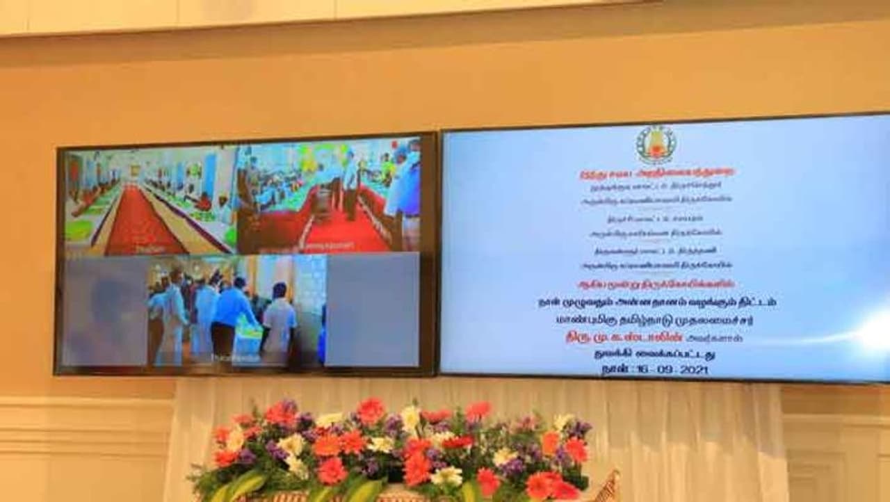 தமிழக முதல்வர் ஸ்டாலின் இன்று தலைமைச் செயலகத்திலிருந்து காணொலி காட்சி வாயிலாக இந்து சமய அறநிலையத் துறை சார்பில் திருசெந்தூர் - அருள்மிகு சுப்பிரமணிய சுவாமி திருக்கோயில், சமயபுரம் - அருள்மிகு மாரியம்மன் திருக்கோயில், திருத்தணி - அருள்மிகு சுப்பிரமணிய சுவாமி திருக்கோயில் ஆகிய திருக்கோயில்களில் நாள் முழுவதும் அன்னதானம் வழங்கும் திட்டத்தை துவக்கி வைத்தார்.
