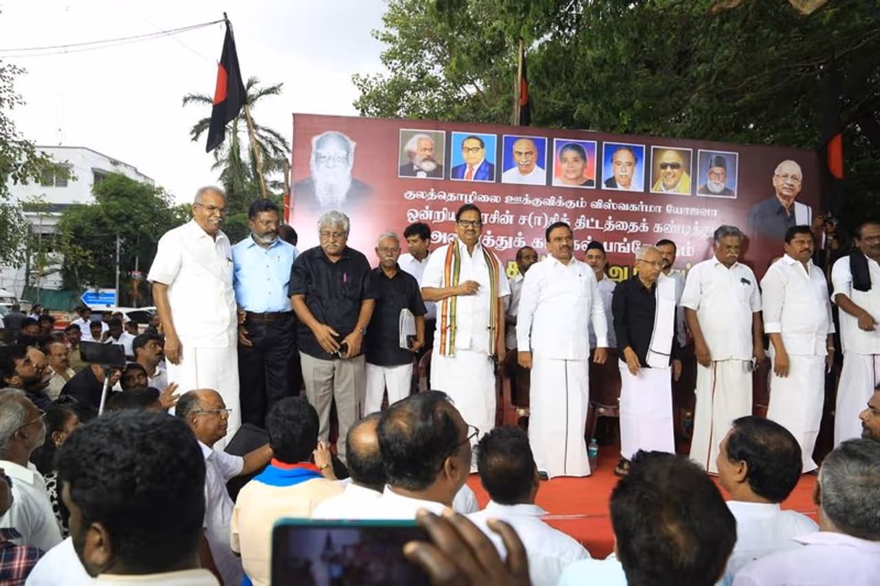 சென்னை வள்ளுவர்கோட்டத்தில் குலத்தொழிலை ஊக்குவிக்கும் விஸ்வகர்மா யோஜனா திட்டத்தை கண்டித்து திக,திமுக , விசிக, காங்கிரஸ், மதிமுக, கம்யூனிஸ்டு கட்சிகள் உள்ளிட்ட அனைத்து கட்சிகள் பங்கேற்ற மாபெரும் கண்டன ஆர்ப்பாட்டம் நடைபெற்றது. இந்த கூட்டத்தில் கலந்து கொண்டு பேசிய விடுதலை சிறுத்தைகள் கட்சி தலைவர் திருமாவளவன், விஸ்வகர்மா யோஜனா என்கிற இந்த திட்டம் மிகவும் ஆபத்தானது சாதிய கட்டமைப்பை நிலைப்படுத்துவதற்கான ஒரு முயற்சி ஆகவே இந்த திட்டத்தை எதிர்த்து வருகிறோம். இந்தியாவில் வேறு எந்த மாநிலத்திலும் இந்த திட்டத்திற்கு எதிரான குரல் ஒலிக்கவில்லை தமிழகத்தில் தான் முதல் குரல் வள்ளுவர் கோட்டத்தில் இருந்து ஒழிக்க தொடங்கி இருக்கிறது.
