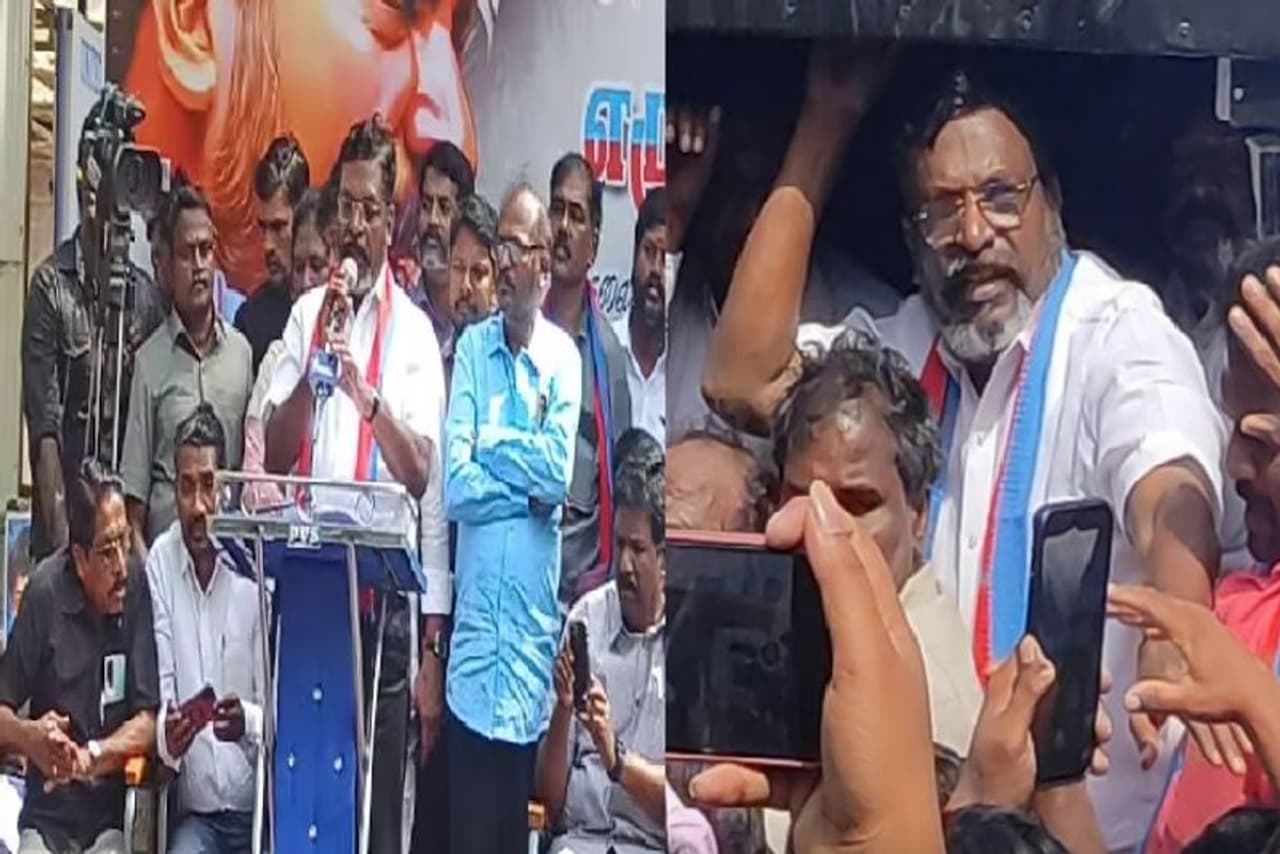 விடுதலை சிறுத்தைகள் சார்பாக நடைபெறும் இந்த ஆர்ப்பாட்டத்தை சிலர், தி.மு.க.விற்கு எதிராகவும் முதலமைச்சருக்கு எதிராகவும் நடத்துவதாக கூறி தி.மு.க. கூட்டணியில் பிளவு ஏற்படுத்த பார்ப்பதாக குற்றம்சாட்டினார். சனாதன சக்திகளை தமிழகத்தில் இருந்து மட்டுமல்ல, இந்தியாவில் இருந்து விரட்ட வேண்டும் என வலியுறுத்தியவர், அதற்காக தமிழகத்தில் தி.மு.க. கூட்டணி இருப்பது போல், இந்தியா முழுவதும் பா.ஜ.க.விற்கு எதிராக கூட்டணிகள் அமைய வேண்டும் அப்பொழுது தான் அதனை செயல்படுத்த முடியும் என கூறினார்.