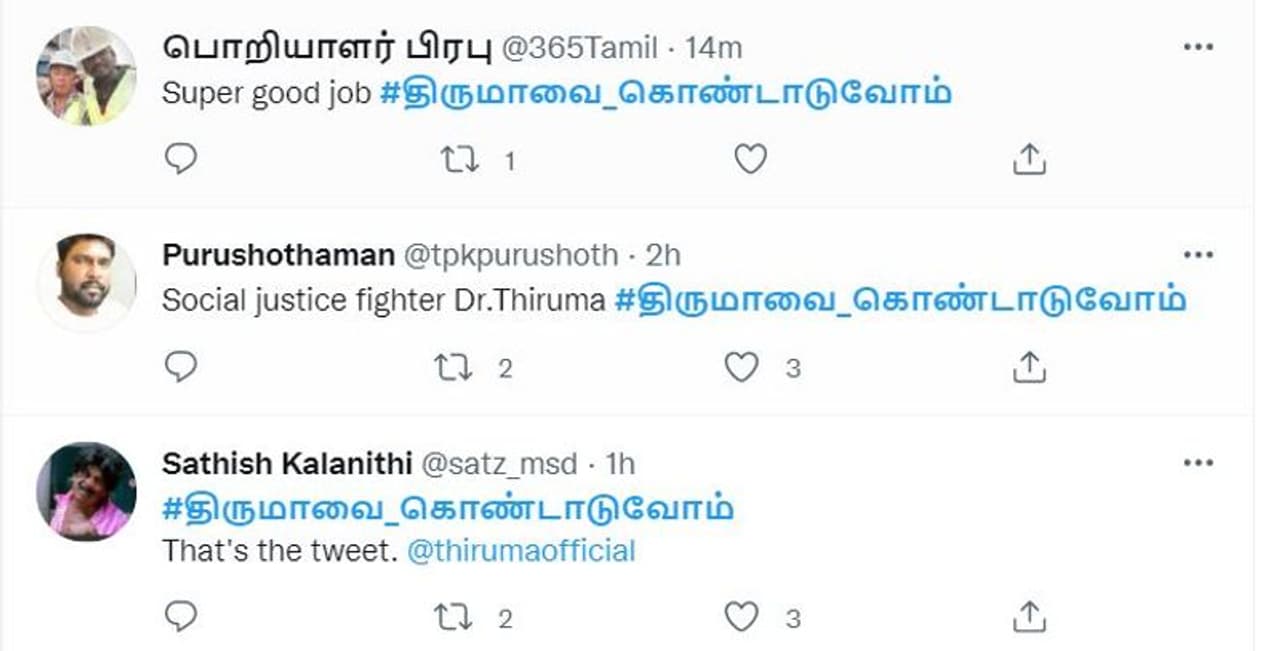 பாஜகவை பிரிச்சு மேயும் அளவுக்கு #திருமாவை_கொண்டாடுவோம் என்ற ஹேஷ்டேக் இணையத்தில் டிரெண்டிங்காகி இருக்கிறது.