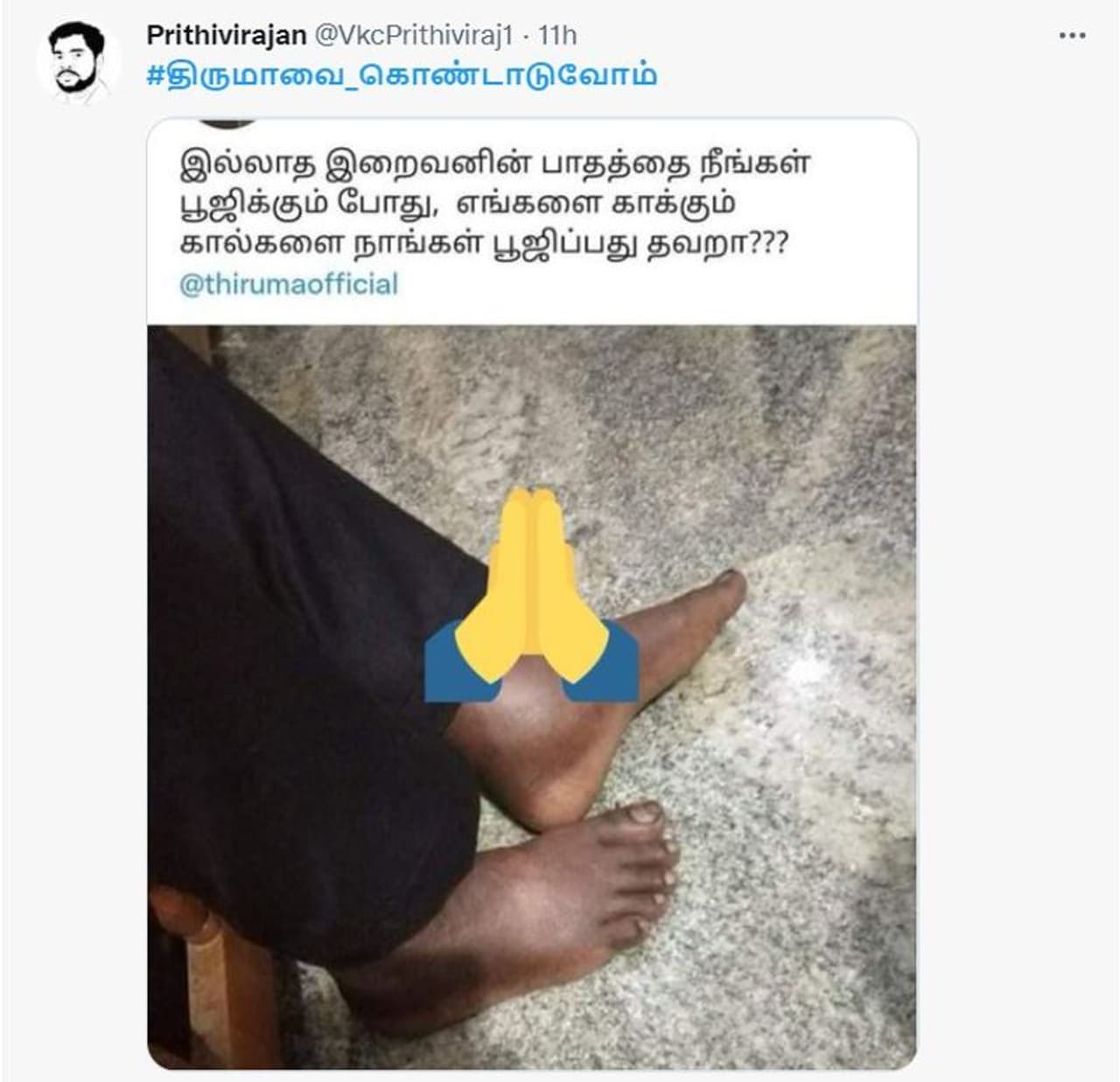 இல்லாத இறைவன் பாதத்தை நீங்கள் பூஜிக்கும் போது எங்களை காக்கும் கால்களை நாங்கள் பூஜிப்பது தவறா? என்று கேள்வி கேட்டு விசிகவினர் திணறடித்து வருகின்றனர்.