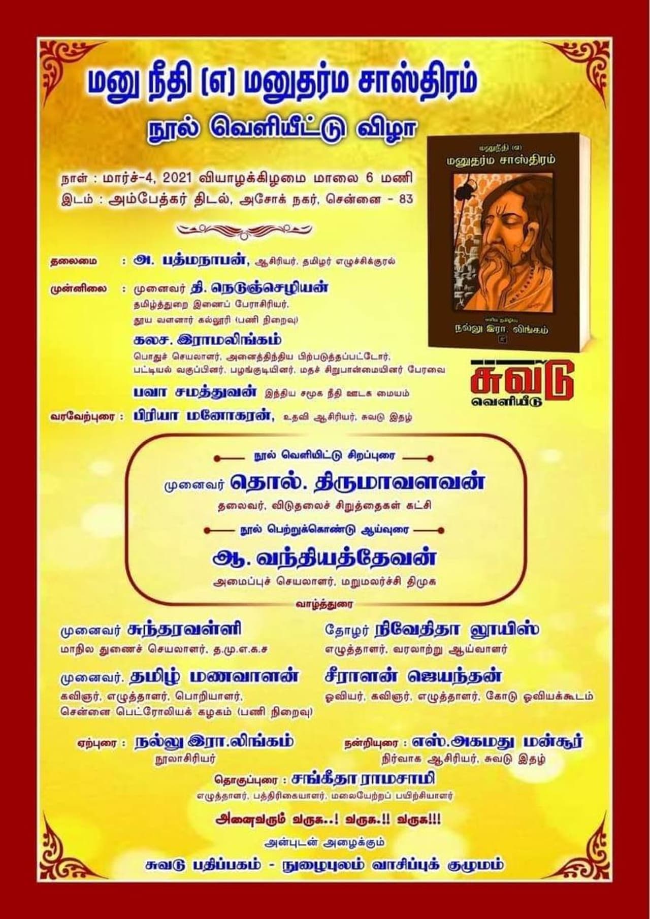நாளை சென்னை அம்பேத்கர் திடலில், மாலை -06 மணியளவில் மனுநீதி மனுதர்ம சாஸ்திரம் நூல் வெளியீட்டு விழாவை நடத்தும் விடுதலை சிறுத்தைகள் கட்சி தலைவரும் நாடாளுமன்ற உறுப்பினருமான தொல்.திருமாவளவனுக்கு எதிர்ப்புக் கிளம்பி இருக்கிறது.