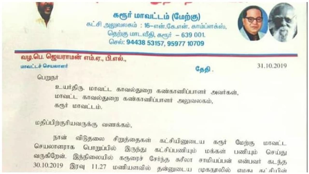 விடுதலை சிறுத்தைகள் கட்சி கரூர் மாவட்ட செயலாளர் ஜெயராமன், கரூர் மாவட்ட எஸ்பி.யிடம் , அதிமுகவை சேர்ந்த சுசீலா சாமியப்பன் என்பவர் மீது திருமாவளவனை பற்றி அரசியல் காழ்ப்புணர்ச்சி காரணமாகவும், சாதிய வன்மத்தின் காரணமாகவும், ஒருமையில் பேசி, தாழ்த்தப்பட்ட சமூகத்தை இழிவுபடுத்தும் நோக்கத்துடனும் முகநூல் பக்கத்தில் பதிவிட்ட்டுள்ளதாகவும் அவர் மீது நடவடிக்கை எடுக்க வேண்டும் எனவும் புகார் அளித்து இருந்தார்.
