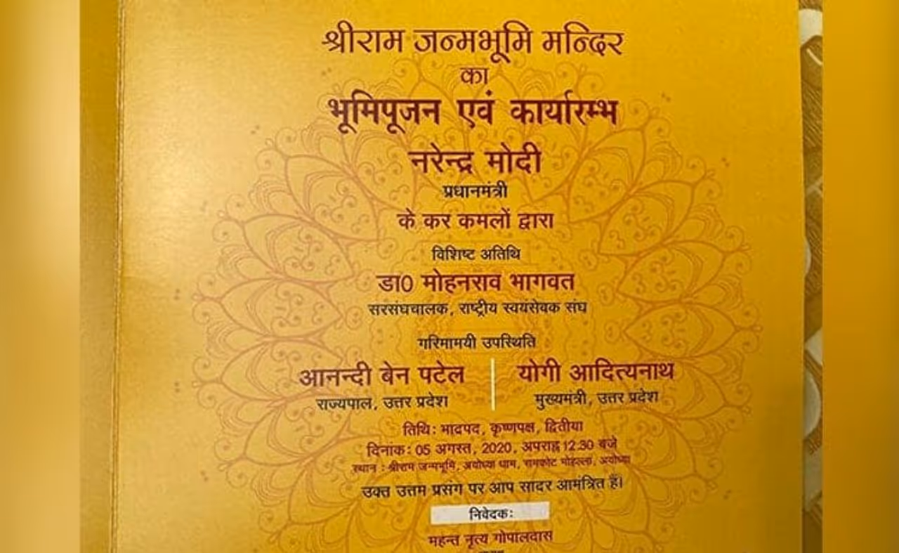 உத்தரபிரதேச மாநிலம் அயோத்தியில் அமைய உள்ள பிரம்மாண்ட ராமர் கோவிலுக்கு வரும் 5-ஆம் தேதி அடிக்கல் நாட்டு விழா நடைபெற உள்ளது. இந்நிகழ்ச்சியில் பிரதமர் நரேந்திர மோடி, ஆர்எஸ்எஸ் தலைவர் மோகன் பகவத் உள்ளிட்ட 170க்கும் குறைவான நபர்கள் மட்டும் கலந்து கொள்ள உள்ளனர். இந்நிகழ்ச்சிக்கான ஏற்பாடுகள் தீவிரமாக நடந்து வரும் நிலையில், அயோத்தி ராமர் கோவில் அடிக்கல் நாட்டு விழாவிற்கான அழைப்பிதழ் வெளியாகியுள்ளது. மஞ்சள் நிற அட்டையில் குங்குமப் பூ நிறத்தில் அழைப்பிதழ் அச்சிடப்பட்டுள்ளது. இந்த அழைப்பிதழ் கடிதத்தில் மோடி உட்பட மேலும் மூவரின் பெயர்கள் இடம்பெற்றுள்ளன. ர் பிரதமர் மோடியை தவிர, ஆர்எஸ்எஸ் தலைவர் மோகன் பகவத், உத்திரப் பிரதேச ஆளுநர் ஆனந்திபென் படேல், முதலமைச்சர் யோகி ஆதித்யநாத் ஆகியோரின் பெயர்கள் அட்டையில் பொறிக்கப்பட்டுள்ளன.