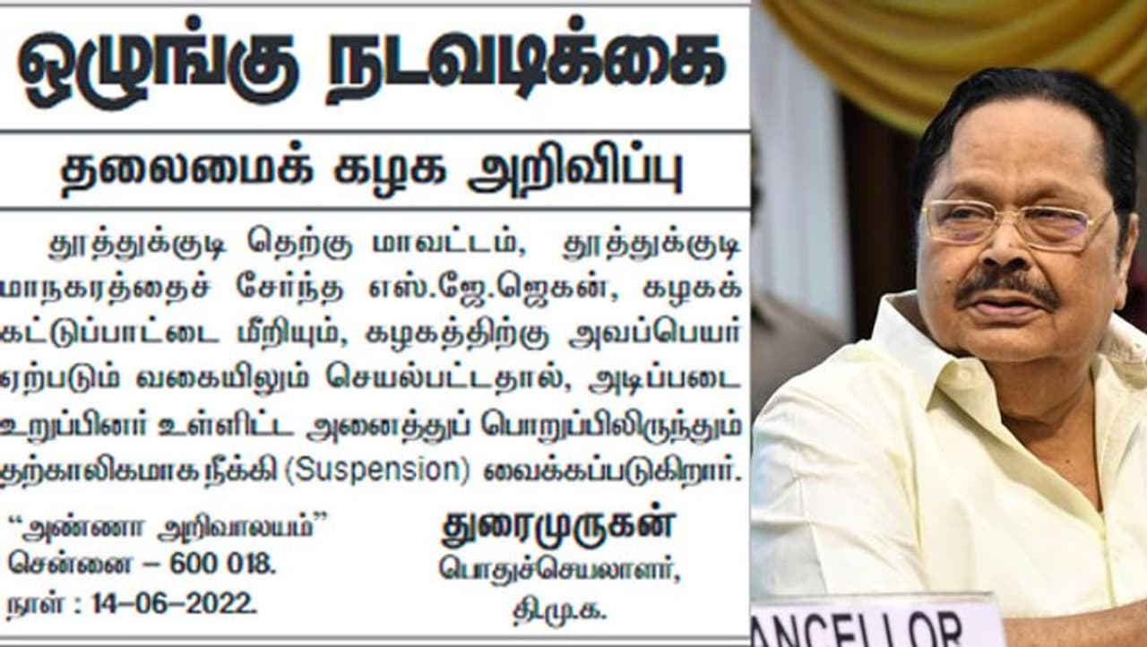 இதுகுறித்து திமுக பொதுச்செயலாளர் துரைமுருகன் வெளியிட்டுள்ள அறிவிப்பில்;- தூத்துக்குடி தெற்கு மாவட்டம் தூத்துக்குடி மாநகரத்தை சேர்ந்த எஸ்.ஜே.ஜெகன் கழகக் கட்டுப்பாட்டை மீறியும், கழகத்திற்கு அவப்பெயர் ஏற்படும் வகையிலும் செயல்பட்டதால் அடிப்படை உறுப்பினர் உள்ளிட்ட அனைத்து பொறுப்பிலிருந்தும் தற்காலிகமாக நீக்கி வைக்கப்படுகிறார் என தெரிவித்துதள்ளார்.
