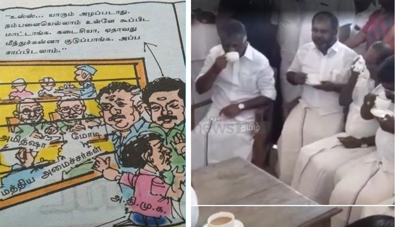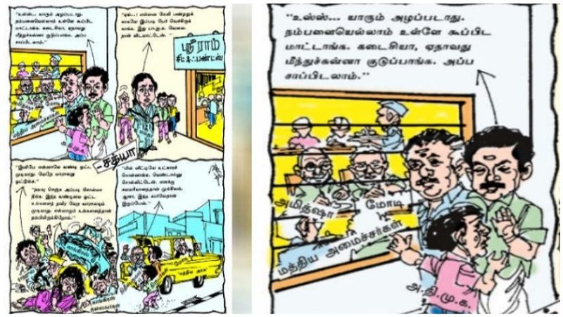 நம்மளையெல்லாம் உள்ள கூப்பிட மாட்டாங்க. கடைசியா ஏதாவது மீந்துச்சுன்னா குடுப்பாங்க. அப்ப சாப்பிடலாம்’ என்ற வாசகங்களை அதிமுகவினரே சொல்வது போல குறிப்பிட்டிருந்தது துக்ளக், அதிமுகவை இல்லை என துக்ளக் கார்ட்டூனிஸ்ட் கூறியுள்ளார்.