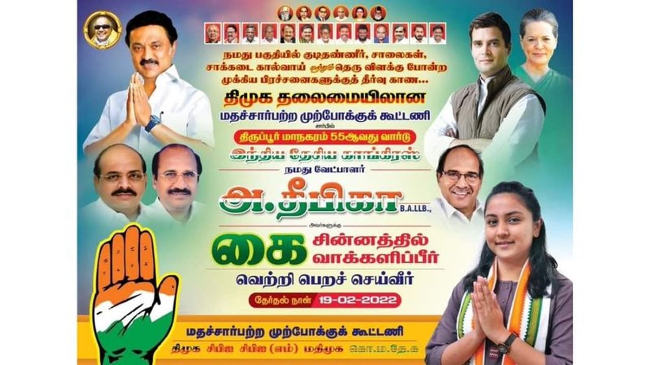 திருப்பூர் மாநகரில் 22 வயது பெண்ணுக்கு காங்கிரஸ் கட்சி சார்பில் 55 வது வார்டில் போட்டியிட வாய்ப்பு வழங்கப்பட்டுள்ளது.