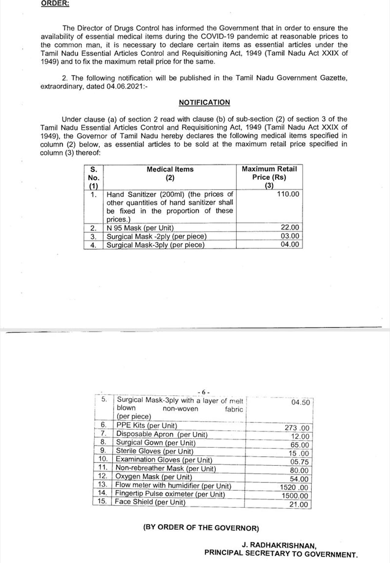 3 அடுக்கு சர்ஜிக்கல் மாஸ்க் ஒன்றுக்கு அதன் தரத்தைப் பொறுத்து அதிக பட்சமாக ரூ.4.50 ஆக விலை நிர்ணயிக்கப்பட்டுள்ளது. 200 மில்லி சானிடைசரை அதிகபட்சமாக 110 ரூபாய்க்கு விற்கலாம் என்றும், N95 முகக்கவசத்தை 22 ரூபாய்க்கு மேல் விற்க கூடாது என்றும் தமிழக அரசு உத்தரவிட்டுள்ளது. பிபிஇ கிட் எனப்படும் கவச உடைக்கான அதிக பட்ச விலை ரூ.273 ஆக நிர்ணயிக்கப்பட்டுள்ளது. ஆக்ஸிஜன் மாஸ்க்கின் அதிகபட்ச விலை 54 ரூபாயாகவும், பல்ஸ் ஆக்சிமீட்டரின் விலை 1,500 ரூபாயும் நிர்ணயித்து தமிழக அரசு உத்தரவு பிறப்பித்துள்ளது.