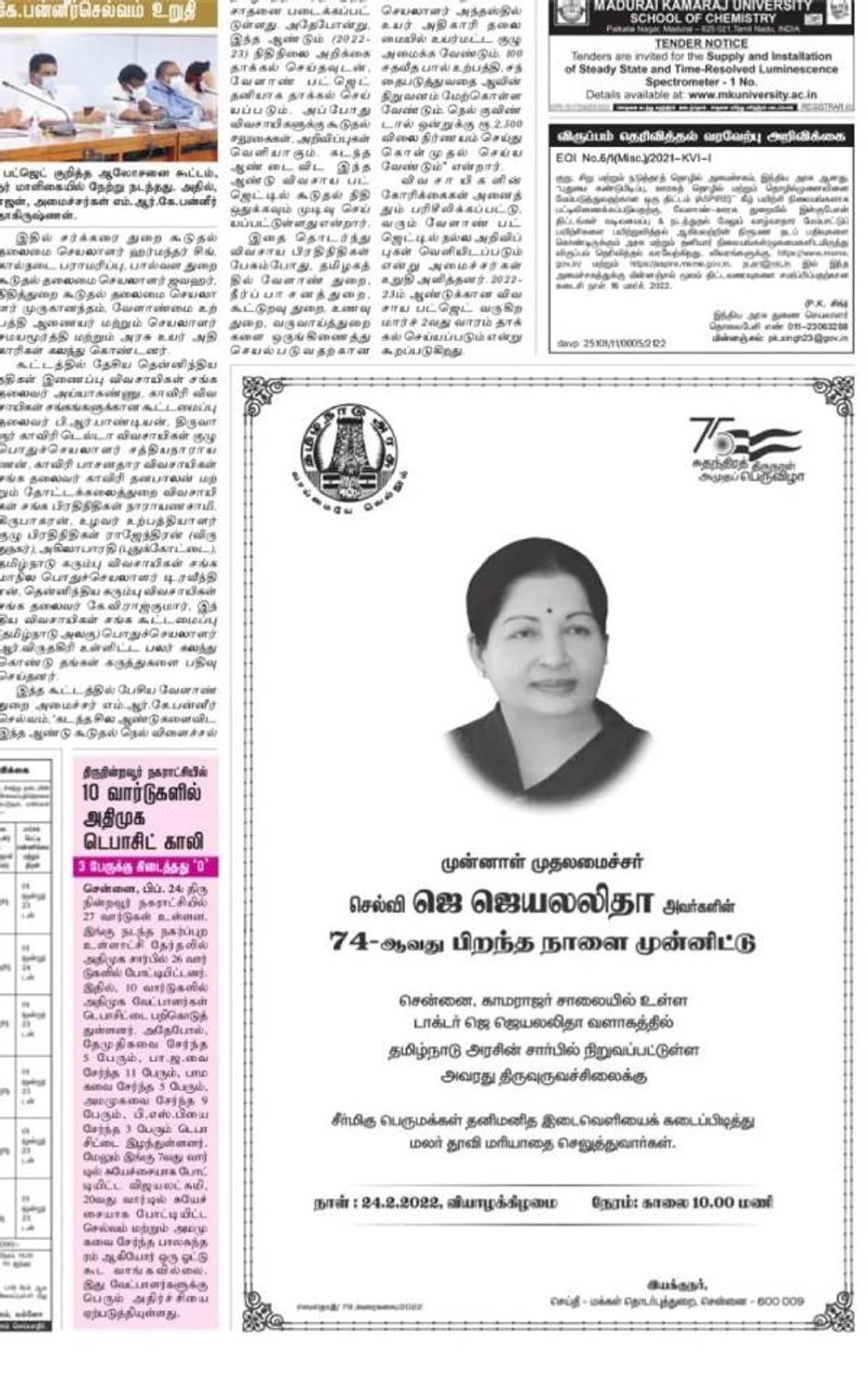 அந்த விளம்பரத்தில், முன்னாள் முதலமைச்சர் ஜெ.ஜெயலலிதா அவர்களின் 74 ஆவது பிறந்த நாளை முன்னிட்டு, சென்னை காமராஜர் சாலையில் உள்ள டாக்டர் ஜெ.ஜெயலலிதா வளாகத்தில் தமிழ்நாடு அரசின் சார்பில் நிறுவப்பட்டுள்ள அவரது திருவுருவச்சிலைக்கு, சீர்மிகு பெருமக்கள் தனிமனித இடைவெளியைக் கடைப்பிடித்து மலர்தூவி மரியாதை செலுத்துவார்கள். நாள்:24.2.2022, வியாழக்கிழமை, நேரம்: காலை 10,00 மணி, இயக்குனர், செய்தி - மக்கள் தொடர்புத்துறை சென்னை என்று அந்த விளம்பரம் வெளியாகி உள்ளது. ஜெயலலிதாவின் புகைப்படமும் அதில் இடம்பெற்றுள்ளது. அரசு சார்பில் தரப்பட்ட இந்த விளம்பரம் பலரது கவனத்தையும் ஈர்த்து வருகிறது. அதிமுகவின் மறைந்த முதல்வர் ஜெ.ஜெயலலிதாவின் 74வது பிறந்தநாளை முன்னிட்டு திமுக அரசு தமிழ் நாளிதழில் இப்படி விளம்பரம் செய்துள்ளது.