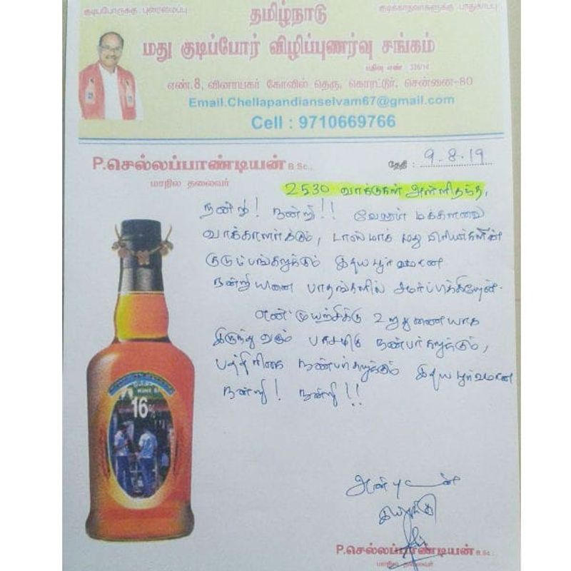 மற்ற கட்சியினரைப்போல் தன் கொள்கைகளை எடுத்து கூறி வேலூர் நாடாளுமன்ற தொகுதியில் பிரச்சாரத்தில் ஈடுபட்ட அவருக்கு வேலூர் நாடாளுமன்ற தொகுதி வேட்பாளர்கள் சுமார் 2530 வாக்குகளை அள்ளி வழங்கியுள்ளனர். இந்நிலையில் தனக்கு வாக்களித்த மக்களுக்கு நன்றி தெரிவிக்கும் வகையில் அவர் அறிக்கை ஒன்றை வெளியிட்டுள்ளார் அதில் , 2530 வாக்குகள் அள்ளி தந்தமைக்கு நன்றி, நன்றி, நன்றி, வேலூர் நாடாளுமன்ற மக்களுக்கும் டாஸ்மாக் மது பிரியர்களின் குடும்பங்களுக்கும் இதய பூர்வமான நன்றியை தங்களின் பொற்பாதங்களில் சமர்ப்பிக்கின்றேன்.என் முயற்ச்சிக்கு உறுதுணையாக உள்ள ஏல்லோருக்கும் நன்றி என்றும் அவர் அந்த அறிக்கையில் தெரிவித்துள்ளார்.