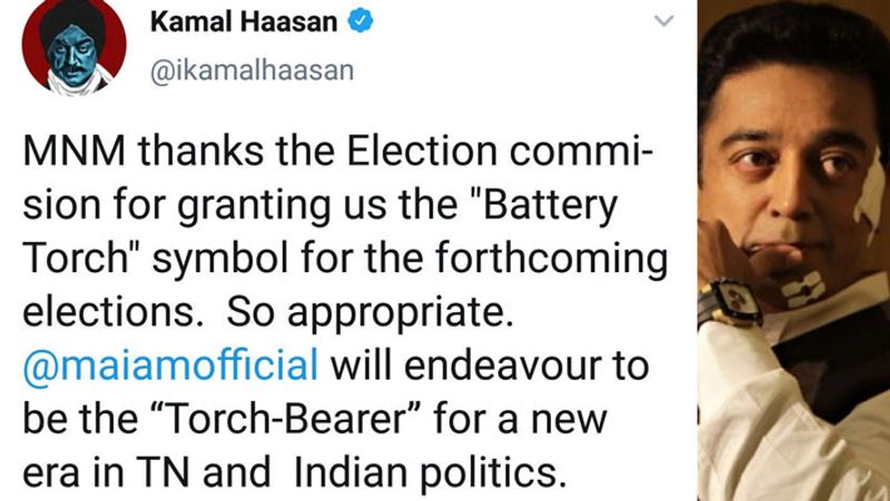 கமல்ஹாசனின் ‘மக்கள் நீதி மய்யம்’ கட்சிக்கு தேர்தல் கமிஷன் ‘டார்ச் லைட்’ சின்னத்தை ஒதுக்கியுள்ளது. இந்த தகவலை இன்று காலை 9:46 மணிக்கு தனது ஐபோனிலிருந்து ஆங்கிலத்தில் ட்விட் செய்திருந்தார் கமல்ஹாசன். அதன் மொழிபெயர்ப்பு... “எதிர்வரும் தேர்தல்களில் எங்களுக்கு ‘பேட்டரி டார்ச்’ சின்னத்தை வழங்கியதற்காக தேர்தல் கமிஷனுக்கு ம.நீ.ம. நன்றிகளை தெரிவித்துக் கொள்கிறது. மிக பொருத்தமான சின்னம் இது. மக்கள்நீதி மய்யம் தமிழக மற்றும் இந்திய அரசியலில் புதிய காலம் துவங்குவதற்கான ஒளி கொடுப்பவனாக இருக்க முயற்சிக்கும்.” என்று சொல்லியிருந்தார்.