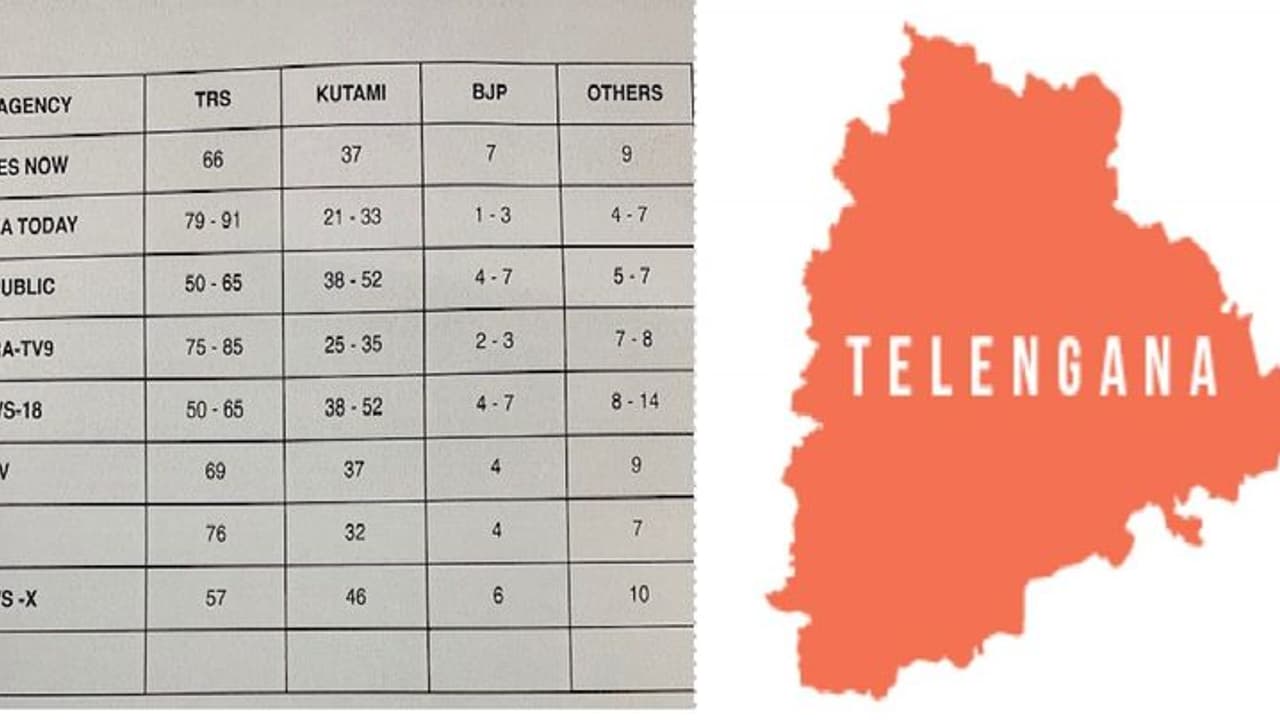 தெலுங்கானாவில் டி.ஆர்.எஸ். கட்சிக்கு 66 இடங்களும், காங்கிரஸ் கட்சிக்கு 37 இடங்களும், பாஜகவுக்கு 7 இடங்களும், மற்றவர்கள் 9 இடங்களிலும் வெற்றி பெற வாய்ப்புள்ளதாக டைம்ஸ் நவ் தேர்தலுக்கு பிந்தைய கருத்துக்கணிப்பில் தெரிவித்துள்ளது.