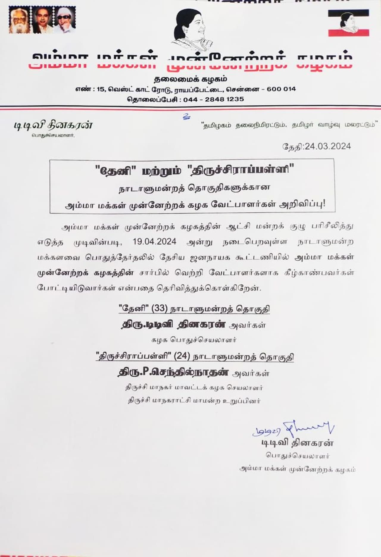 நாடாளுமன்ற தேர்தல் தேதி அறிவிக்கப்பட்டுள்ள நிலையில், தேர்தல் களத்தில் அரசியல் கட்சிகள் இறங்கியுள்ளன. அந்த வகையில் பாஜக கூட்டணியில் இடம்பெற்றிருந்த அமமுகவிற்கு இரண்டு தொகுதிகள் ஒதுக்கப்பட்டுள்ளது. அந்த வகையில், நாடாளுமன்ற தேர்தலில் அம்மா மக்கள் முன்னேற்ற கழகம் சார்பில் போட்டியிட உள்ள வேட்பாளர்கள் அறிவிக்கப்பட்டுள்ளனர். தேனி தொகுதியில் - டிடிவி தினகரன், திருச்சி தொகுதியில் - செந்தில் நாதன் ஆகியோர் போட்டியிடவுள்ளனர். இதற்கான அறிவிப்பை டிடிவி தினகரன் வெளியிட்டுள்ளார்.