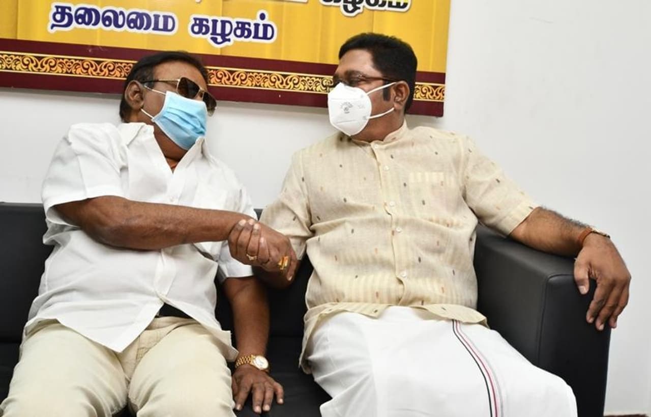 சென்னை கோயம்பேட்டில் உள்ள தேமுதிக அலுவலகத்தில் அதன் தலைவர் விஜயகாந்த்தை சந்தித்த பின் டிடிவி தினகரன் செய்தியாளர்களை சந்தித்தார். அப்போது பேசிய அவர், எங்களுடைய வெற்றி கூட்டணியில் மரியாதை நிமித்தமாக சந்தித்தோம். எங்களுடைய கொள்கை தமிழகத்தில் தீய சக்தியான திமுகவையும், துரோக கட்சியான கூட்டணியையும் ஆட்சிக்கு வர விட கூடாது என்பது தான். இந்த தேர்தலை பொறுத்தவரை எங்களுடைய ஒரே எண்ணம் திமுக, அதிமுகவை அகற்றுவது தான். SDPI உடன் கடந்த முறையில் இருந்தே கூட்டணியில் உள்ளோம். தற்போது தேமுதிக உடன் உடன்பாடு எட்டப்பட்டு கூட்டணி அமைத்துள்ளோம். சசிகலாவின் மானசீக ஆதரவு எங்களுக்குதான் உள்ளது.