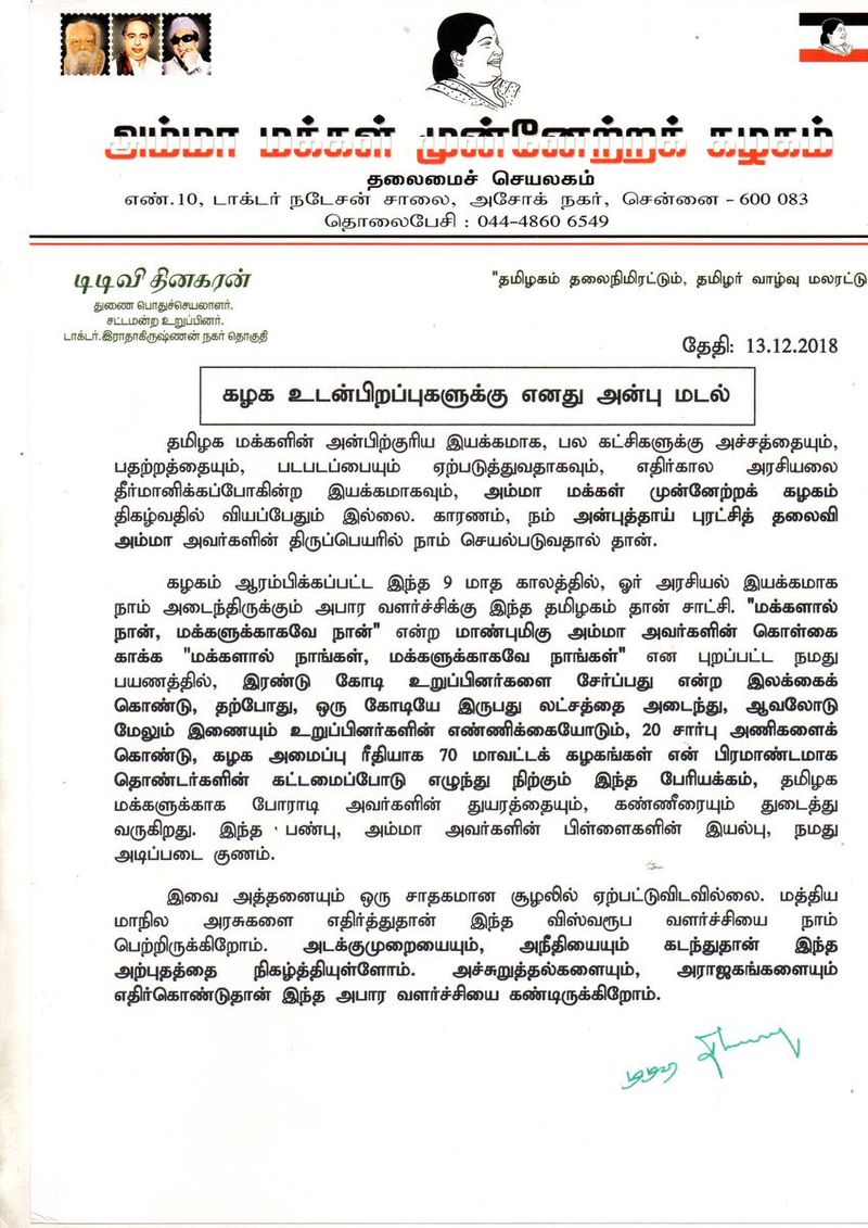 இதுகுறித்து அவர் வெளியிட்டுள்ள அறிக்கையில், ‘’மத்திய, மாநில அரசுகளை எதிர்த்துதான் இந்த விஸ்வரூப வளர்ச்சியை அடைந்திருக்கிறோம். அடக்கு முறையையும், அநீதியையும் கடந்து தான் இந்த அற்புதத்தை நிகழ்த்தியுள்ளோம். அச்சுறுத்தல்களையும், அராஜாகங்களையும் எதிர்கொண்டு தான் இந்த அபார வளர்ச்சியை கண்டிருக்கிறோம். திரும்பிய திசையெல்லாம் தடைகள் இருந்தபோதும் தடந்தோள்தட்டி தடம் பதித்த வெற்றியினை ஆர்.கே.நகரில் பெற்றோம். துரோக பழனிசாமி கூட்டத்திற்கு தோல்வியை தந்து எதிர்கட்சி என மார்தட்டிய திமுகவை டெபாசிட் இழக்கச் செய்து ஒரு சுயேட்சையாக வாகை சூடி நின்றோம்.