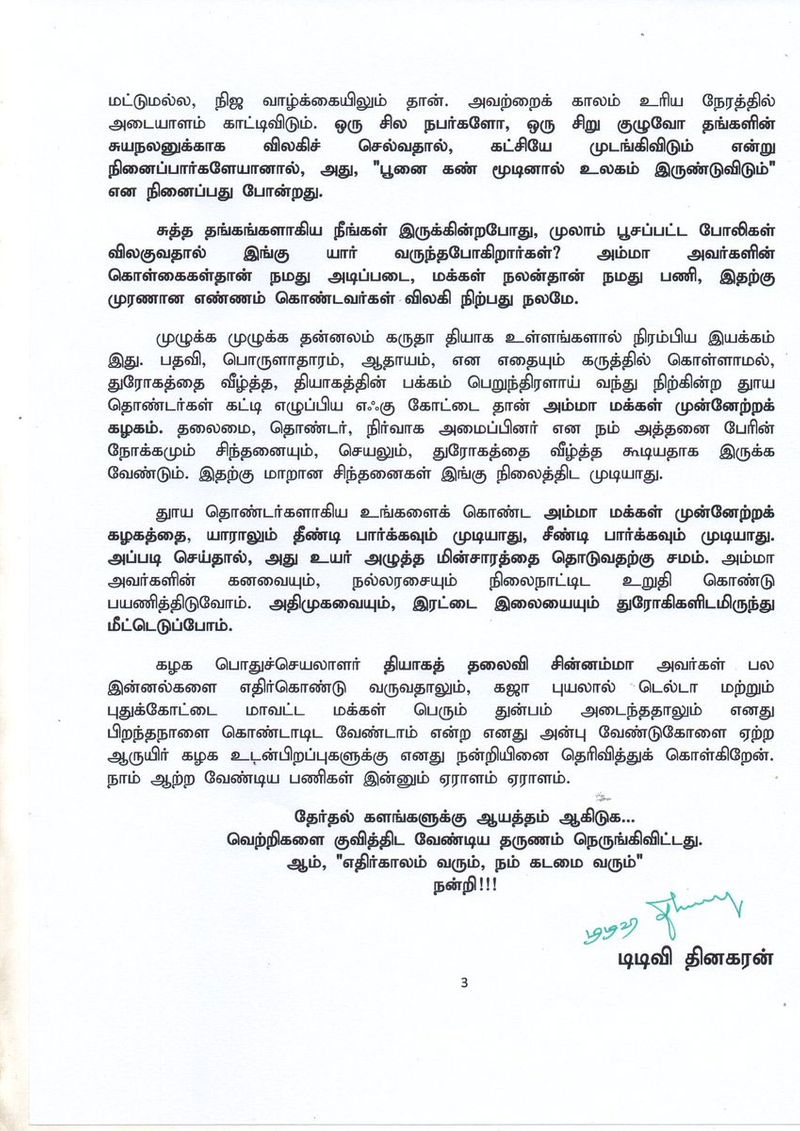 ராமநாதபுரம் மாவட்டத்தை சேர்ந்த ஒரு அமைப்பு செயலாளர் அம்மாவட்டத்தில் எழுச்சியோடு செயல்பட்டுக் கொண்டிருக்கும் தற்போதைய மாவட்ட செயலாளரை மாற்றி, அந்த வாய்ப்பை தனக்கு அளித்திட வேண்டுமென வைத்த கோரிக்கையை நிராகரித்த காரணத்தாலும், தனது தனிப்பட்ட தேவைகளை பூர்த்தி செய்து கொள்ளவும் துரோகத்தின் பக்கம் சாய்துள்ளார். மேலும் கரூர் மாவட்டம் அரவக்குறிச்சியில் அதிமுக ( அம்மா) என்ற பெயரில் நாம் இயங்கியபோது அறிவிக்கப்பட்டிருந்த ஒரு ஒன்றிய கழக செயலாளர் (செந்தில் பாலாஜி) நேற்று கட்சியை விட்டு சென்றுவிட்டாராம். அதனை தற்போது ஊடகங்களில் பெரிதுபடுத்தி காட்டப்படுகிறது.
