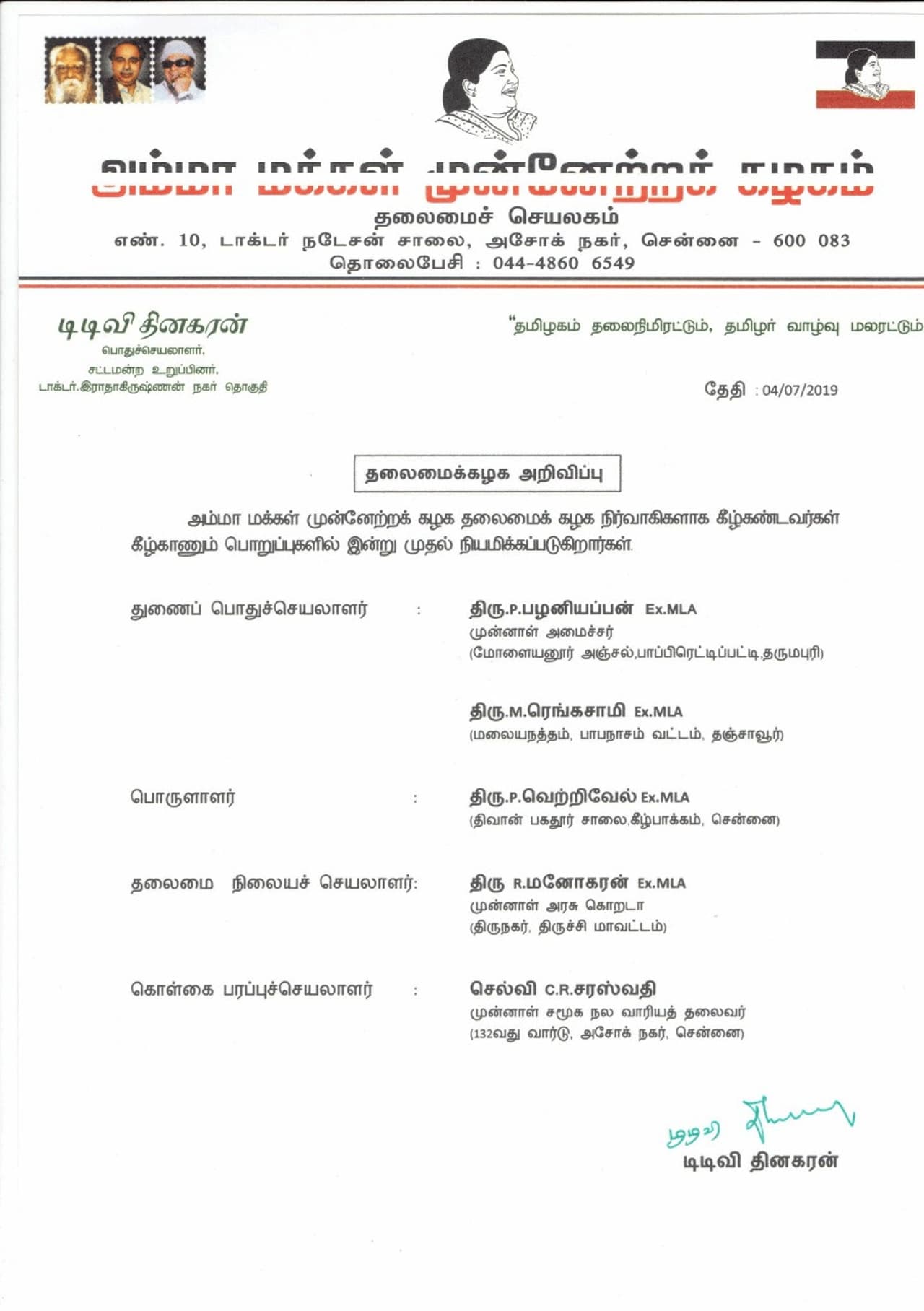 அதேபோல், அமமுக பொருளாளராக முன்னாள் எம்.எல்.ஏ. பி.வெற்றிவேலும், அமமுக கொள்கை பரப்புச்செயலாளர் தங்க தமிழ்செல்வன் விலகலை அடுத்து சி.ஆர்.சரஸ்வதி நியமனம் செய்யப்பட்டுள்ளார். அமமுக தலைமை நிலையச் செயலாளராக திருச்சி ஆர்.மனோகரன் நியமிக்கப்பட்டுள்ளார்.
