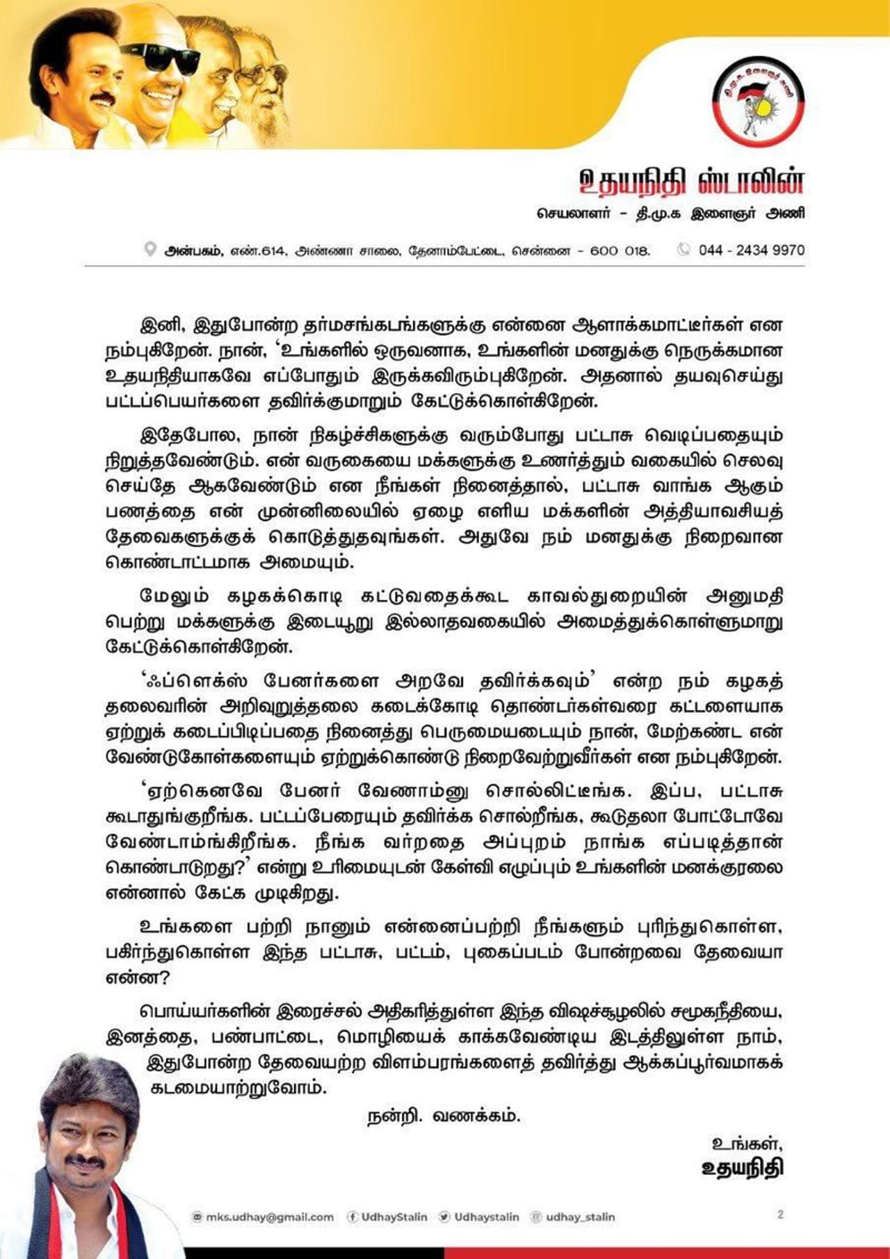இனி இதுபோன்ற தர்மசங்கடங்களுக்கு என்னை ஆளாக்க மாட்டீர்கள் என நம்புகிறேன். நான் உங்களில் ஒருவனாக உங்களின் மனதுக்கு நெருக்கமான உதயநிதியாகவே எப்போதும் இருக்க விரும்புகிறேன்; அதனால் தயவு செய்து பெயர்களை தவிர்க்குமாறு கேட்டுக்கொள்கிறேன். இதேபோல நிகழ்ச்சிகளுக்கு வரும்போது பட்டாசு வெடிப்பதும் நிறுத்த வேண்டும். என் வருகையை உங்களுக்கு உணர்த்தும் வகையில் செலவு செய்தே ஆகவேண்டும் என நீங்கள் நினைத்தால் பட்டாசு வாங்கும் பணத்தை என் முன்னிலையில் ஏழை எளிய மக்களின் அத்தியாவசிய தேவைகளுக்கு கொடுத்து உதவுங்கள். அதுவே நம் மனதுக்கு நிறைவான கொண்டாட்டமாக அமையும் .மேலும் கழக கொடி கட்டு வதை கூட காவல்துறையின் அனுமதி பெற்று மக்களுக்கு இடையூறு இல்லாத வகையில் அமைத்துக் கொள்ளுமாறு கேட்டுக்கொள்கிறேன்.