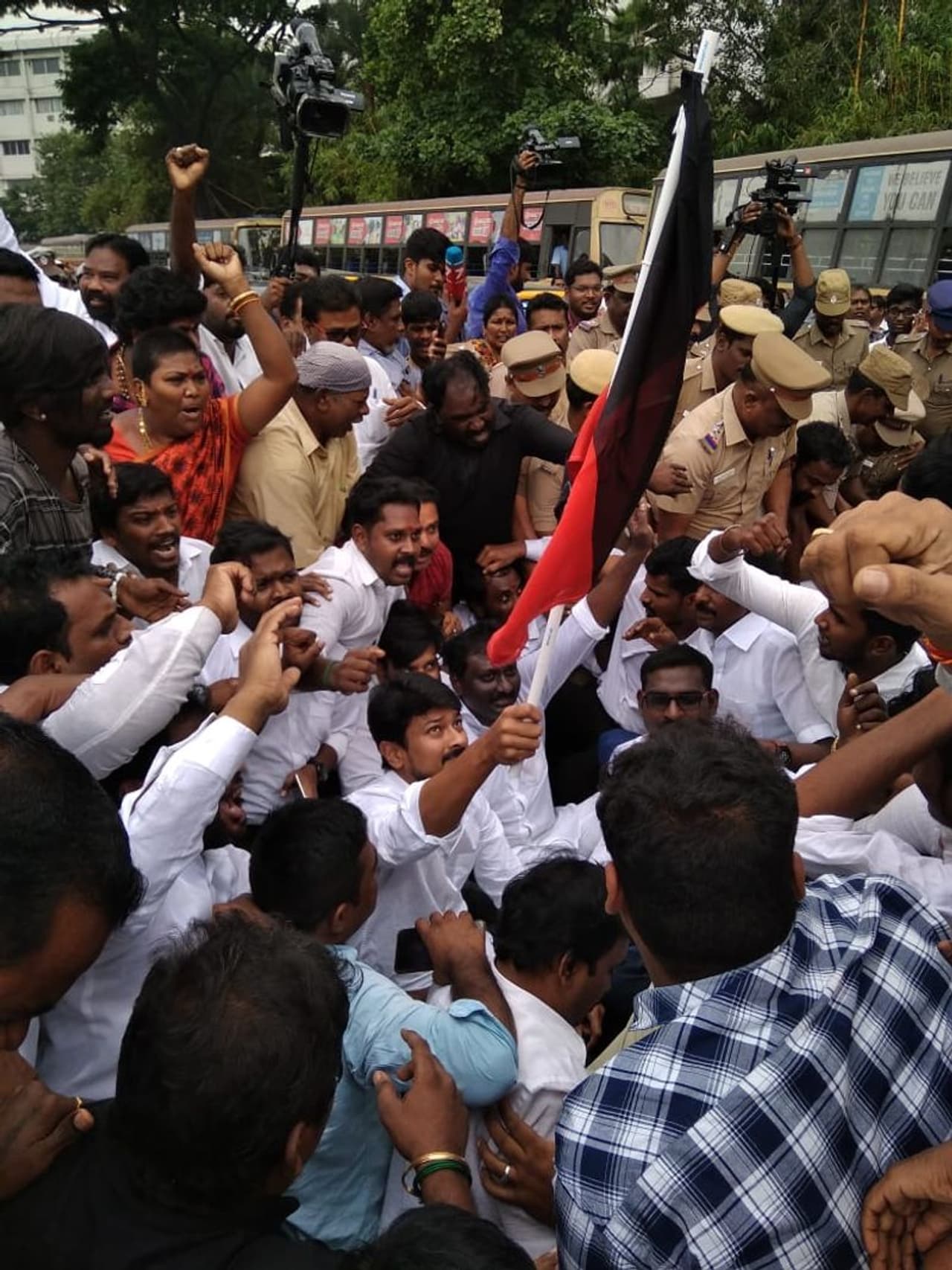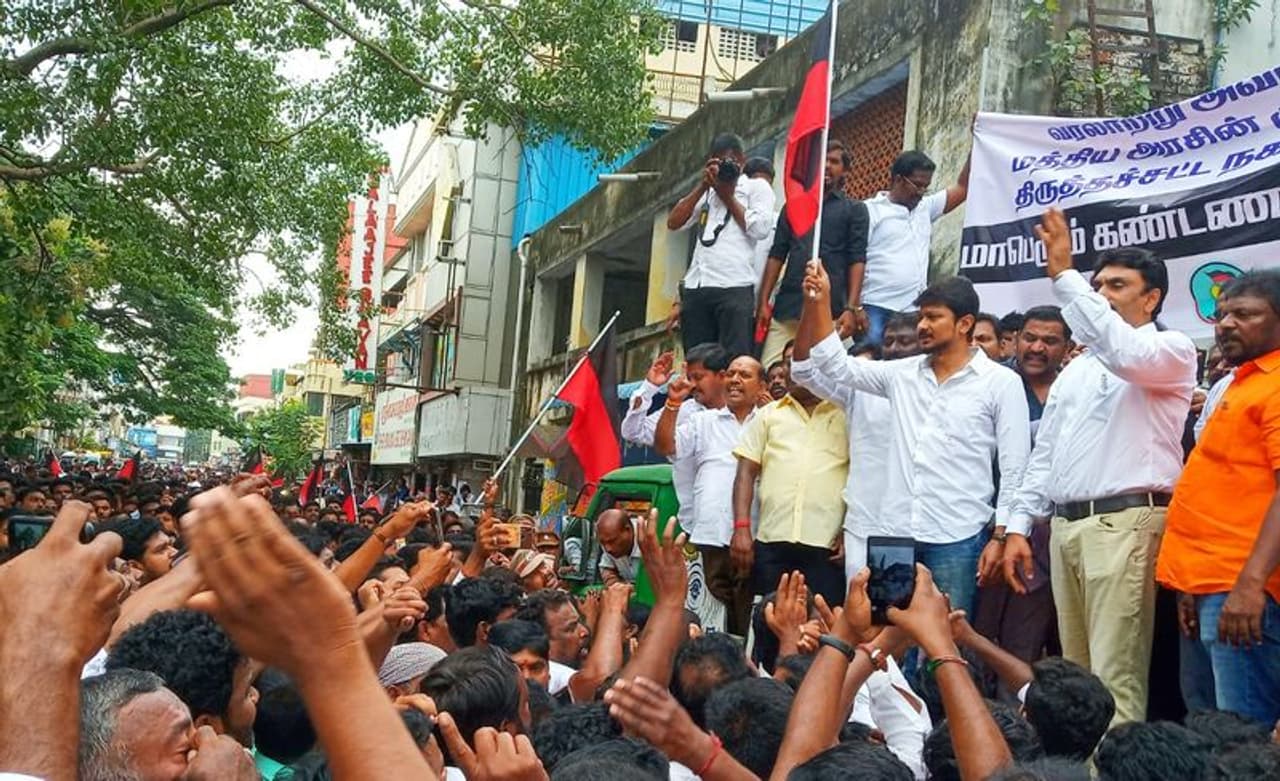 சைதாப்பேட்டை பஜார் சாலையில் இருந்து ஊர்வலமாக தொடங்கி தபால் நிலையம் வரை ஊர்வலமாக தனது தொண்டர்களுடன் சென்றார் உதயநிதி. போராட்டத்தில் ஈடுபட்டவர்களை கட்டுப்படுத் போலீசார் முயன்றனர்.