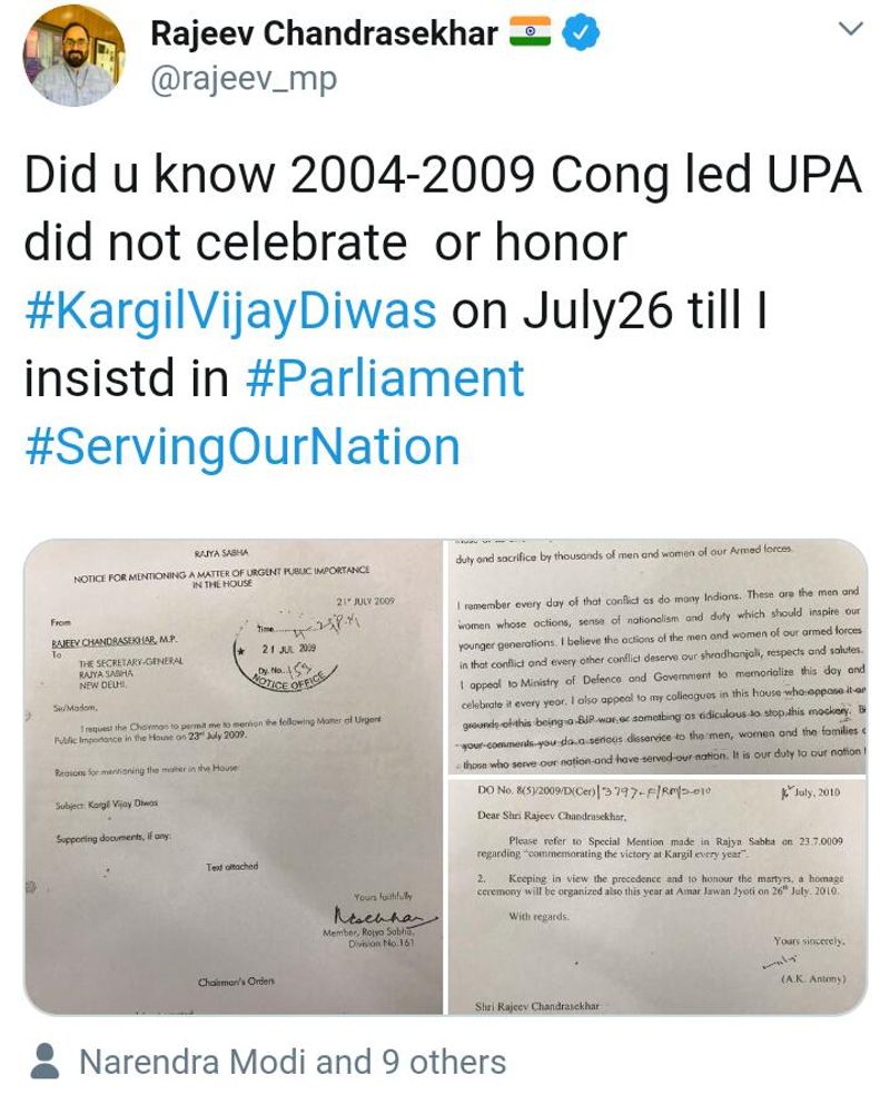 கடந்த 2009 ஆம் ஆண்டு பாதுகாப்புத் துறை அமைச்சராக இருந்த ஏ.கே.ஆண்டனிக்கு இது குறித்து தான் 2009 ஆண்டு நினைவூட்டல் கடிதம் எழுதியதை குறிப்பிட்டுள்ளார். அதில் எதிர்வரும் இளம் சந்ததியினர் அறிந்து கொள்ளும் வகையில் ஜுலை 26 ஆம் தேதியை கார்கில் வெற்றி தினமாக கொண்டாட வேண்டும் என அந்த கடிதத்தில் அறிவுறுத்தியிருத்ததையும் ராஜீவ் சந்திரசேகர் குறிப்பிட்டுள்ளார்.