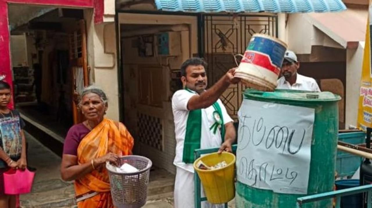 நகர்ப்புற உள்ளாட்சித் தேர்தலையொட்டி, மதுரை மாநகராட்சி 24-வது வார்டில் போட்டியிடும் சுயேச்சை வேட்பாளர் ஒருவர் வீடு வீடாக சென்று குப்பை சேகரித்து நூதன பிரச்சாரத்தில் ஈடுபட்டு வருகிறார்.