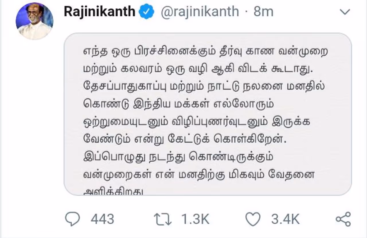 மசோதாவிற்கு ஆதராகவும் சிலர் கருத்து தெரிவித்து வருகின்றனர். இந்த நிலையில் நேற்று இரவு நடிகர் ரஜினிகாந்த் எந்த பிரச்சனைக்கும் வன்முறை தீர்வாகாது என்று ட்வீட் செய்திருந்தார். நாட்டில் நடைபெறும் வன்முறை சம்பவங்கள் வேதனை அளிப்பதாகவும் தெரிவித்திருந்தார். ரஜினிகாந்தின் இந்த கருத்துக்கு ஆதரவும் எதிர்ப்பும் வலுத்து வருகிறது. திமுக இளைஞரணி செயலாளர் உதயநிதி ஸ்டாலினும் ரஜினியை மறைமுகமாக தாக்கியிருக்குகிறார்.