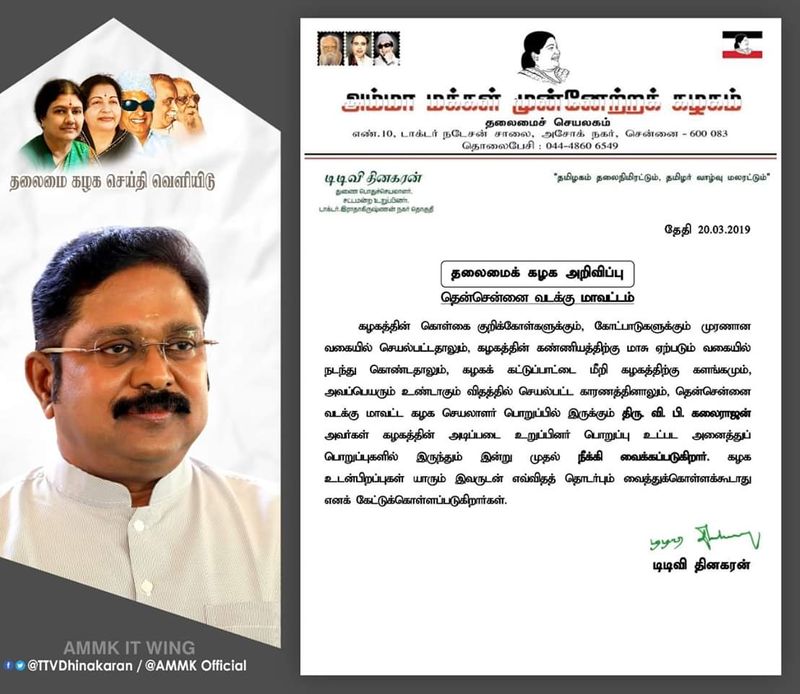 இந்நிலையில் தான் தமிழகம் முழுவதும் அமமுக போட்டியிடும் 24 எம்.பி.தொகுதி வேட்பாளர்களையும், 9 சட்டமன்ற தொகுதி இடைத் தேர்தல் வேட்பாளர்களையும் தினகரன் அறிவித்தார். இதனிடையே அதிரடி திருப்பமாக தென் சென்னை வடக்கு மாவட்ட கழகச் செயலாளராக இருந்து வந்த வி.பி.கலைராஜன் அக்கட்சியில் இருந்து நீக்கப்பட்டுள்ளார்.