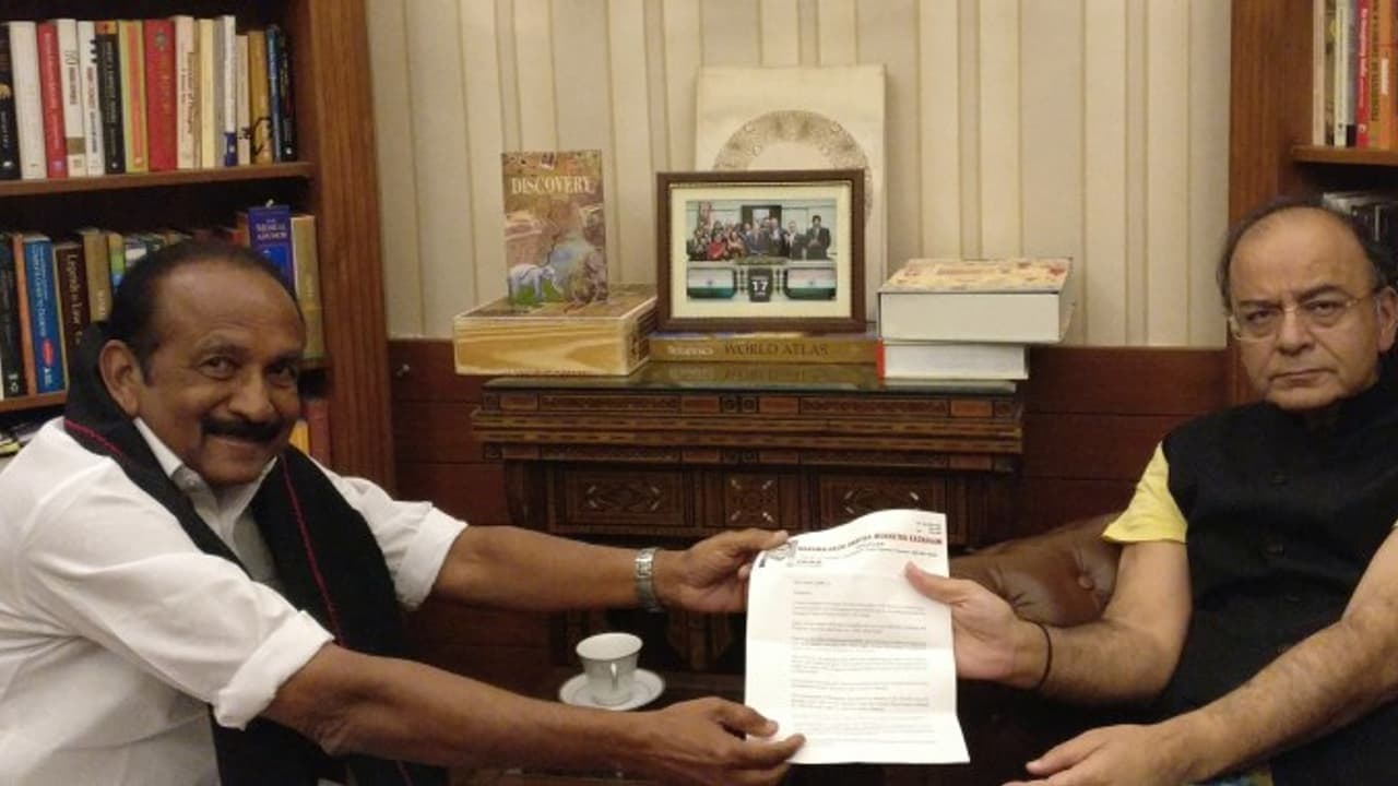 மதிமுக பொது செயலளர் வைகோ, மத்திய நிதி அமைச்சர் அருண் ஜெட்லியை டெல்லியில் சந்தித்தார். அப்போது தமிழக விவசாயிகள் சார்பில், மனு ஒன்றை கொடுத்தார். அதில் கூறியிருப்பதாவது.