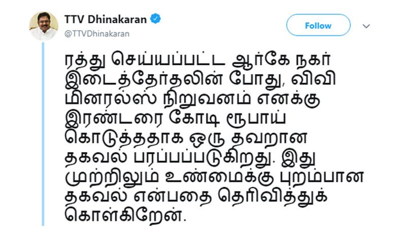ஆர்.கே.நகர் இடைத்தேர்தலின் போது டி.டி.வி தினகரனுக்கு வி.வி.மினரல்ஸ் வைகுண்டராஜன் இரண்டரை கோடி ரூபாய் கொடுத்ததற்கான ஆவணங்கள் கிடைத்துள்ளதாக வருமான வரித்துறை வெளியிட்ட தகவலால் அதிர்ச்சி அடைந்த தினகரன் உடனடியாக அதனை மறுத்து ட்வீட்டியுள்ளார்.