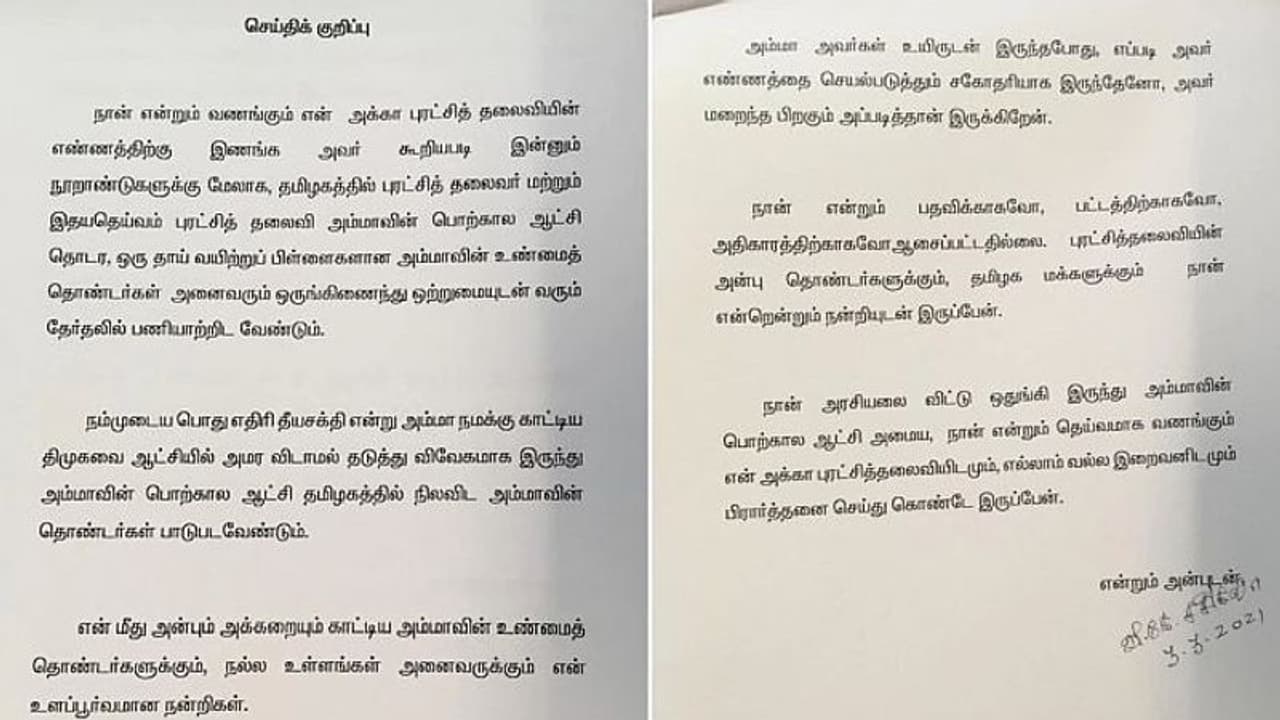 இந்நிலையில் விகே சசிகலா அரசியலில் இருந்து ஒதுங்குவதாக வெளியிட்டுள்ள அறிக்கை பரபரப்பை கிளப்பியுள்ளது.