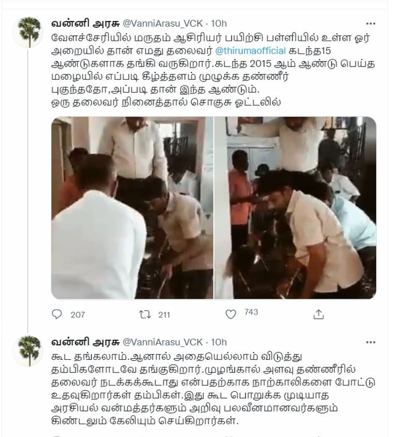 வேளச்சேரியில் உள்ள திருமாவளவன் வீட்டில் தண்ணீர் உட்புகுந்தது. நாடாளுமன்ற கூட்டத்தொடரில் பங்கேற்க டெல்லி செல்ல வேண்டி இருந்ததால் கால் நனையாமல் இருக்க உடனடியாக தொண்டர்கள் ஒரு காரியம் செய்தனர். பார்வையாளர்களுக்காக போடப்பட்டு இருந்த இரும்பு சேர்களை ஒவ்வொன்றாக இழுத்து பாதையாக மாற்றி தர…அதில் கால் நனையாமல் திருமாவளவன் நடந்து, தாவி சென்று காரில் ஏறினார்.