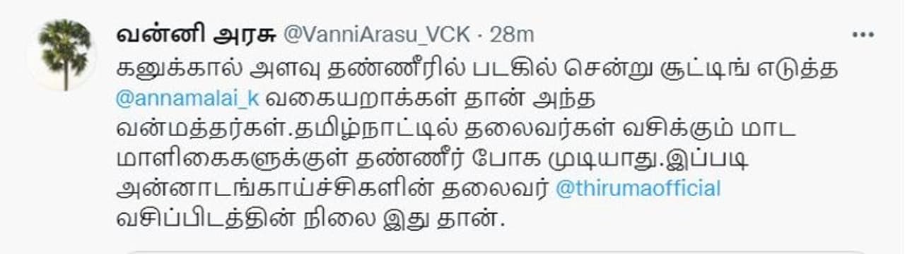 கணுக்கால் அளவு தண்ணீரில் படகில் போய் ஷூட்டிங் எடுத்தவர் அண்ணாமலை என்று விசிகவின் வன்னிஅரசு போட்டு தாக்கி இருக்கிறார்.