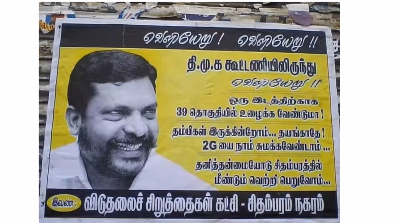திருமாவளவனுக்கு அறிவுரை கூறும் விதமாக அடிக்கப்பட்டிருக்கும் இந்த போஸ்டரில் ஒரு இடத்துக்காக 39 இடத்தில் உழைக்க வேண்டுமா? திமுக கூட்டணியில் இருந்து வெளியேறு. தனித்தன்மையோடு சிதம்பரத்தில் மீண்டும் தனித்து வெற்றி பெறுவோம். 2ஜியை நாம் சுமக்க வேண்டாம்.