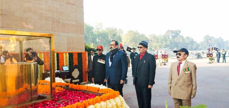 பாகிஸ்தானுக்குஎதிராககடந்த 1971–ம்ஆண்டுநடந்தபோரில்இந்தியாவெற்றிபெற்றது. இந்தவெற்றியைநினைவுகூறும்வகையில்ஒவ்வொருஆண்டும்டிசம்பர் 16–ந்தேதிநாடுமுழுவதும் ‘விஜய்திவாஸ்’ என்றபெயரில்வெற்றிநிகழ்ச்சிநடத்தப்படுகிறது இந்தபோரில்உயிர்தியாகம்செய்தவீரர்களின்நினைவாகஅமைக்கப்பட்டுள்ளஅமர்ஜவான்ஜோதியில் இன்று முக்கிய தலைவர்கள் மலர் வளையம் வைத்துஅஞ்சலி செலுத்தினர்.