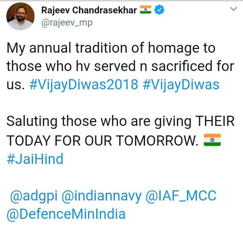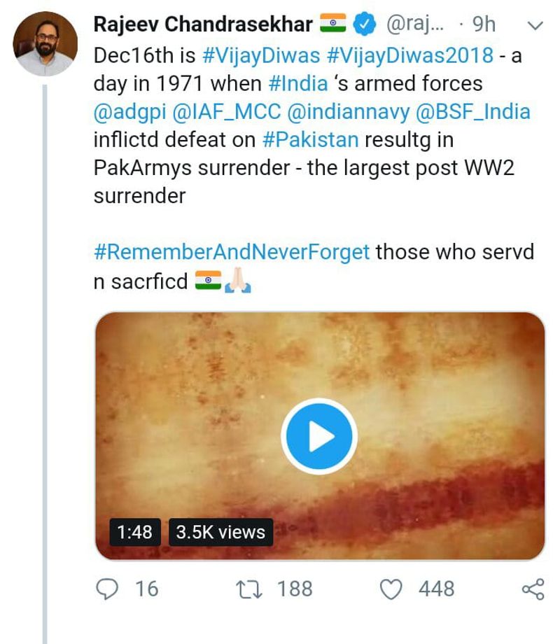 இது தொடர்பாக ராஜீவ் சந்திரசேகர் தனது முகநூல் பக்கத்தில், வெளியிட்டுள்ள செய்தியில், இந்தியா – பாகிஸ்தான் இடையே நடைபெற்ற மாபெரும் போரில் டிசம்பர் 16 என்பது மறக்க முடியாத நாள்.. போர் உச்ச கட்டத்தை அடைந்த அந்த நாள்.. பாகிஸ்தான் மீது இந்தியாவின்வெற்றி… , விஜய்திவாஸ் 48 வதுஆண்டுநிறைவு நாள் இன்று கொண்டாடப்படுவதாக குறிப்பிட்டுள்ளார்.