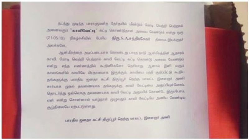 மேலும், கடிதம் ஒன்றும் பார்சலாக வந்துள்ளது. அதில், பாஜக திருப்பூர் தெற்கு மாவட்ட இளைஞர் அணி என்றும், ஆன்மீகத்தை அடிப்படைய்டாகக் கொண்டது பாரத நாடு. ஆன்மீகத்தின் ஆதாரம் காவி. மோடி வெற்றி பெற்றால் காவி வேட்டி கட்டிக் கொண்டு அலைய வேண்டும் என்று எந்த எண்ணத்தில் கூறினீர்களோ தெரியாது.