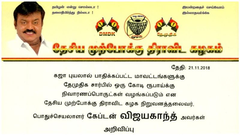 உடல் நலக்குறைவுக்காக மேல் சிகிச்சைக்காக அமெரிக்கா செல்லவேண்டிய நிலையிலும், மக்களின் துயர் துடைக்கும் நல்லெண்ணத்தில் கஜா புயலுக்காக ஒரு கோடியை நிவாரண நிதியாக அறிவித்திருக்கிறார் கேப்டன் விஜயகாந்த்.