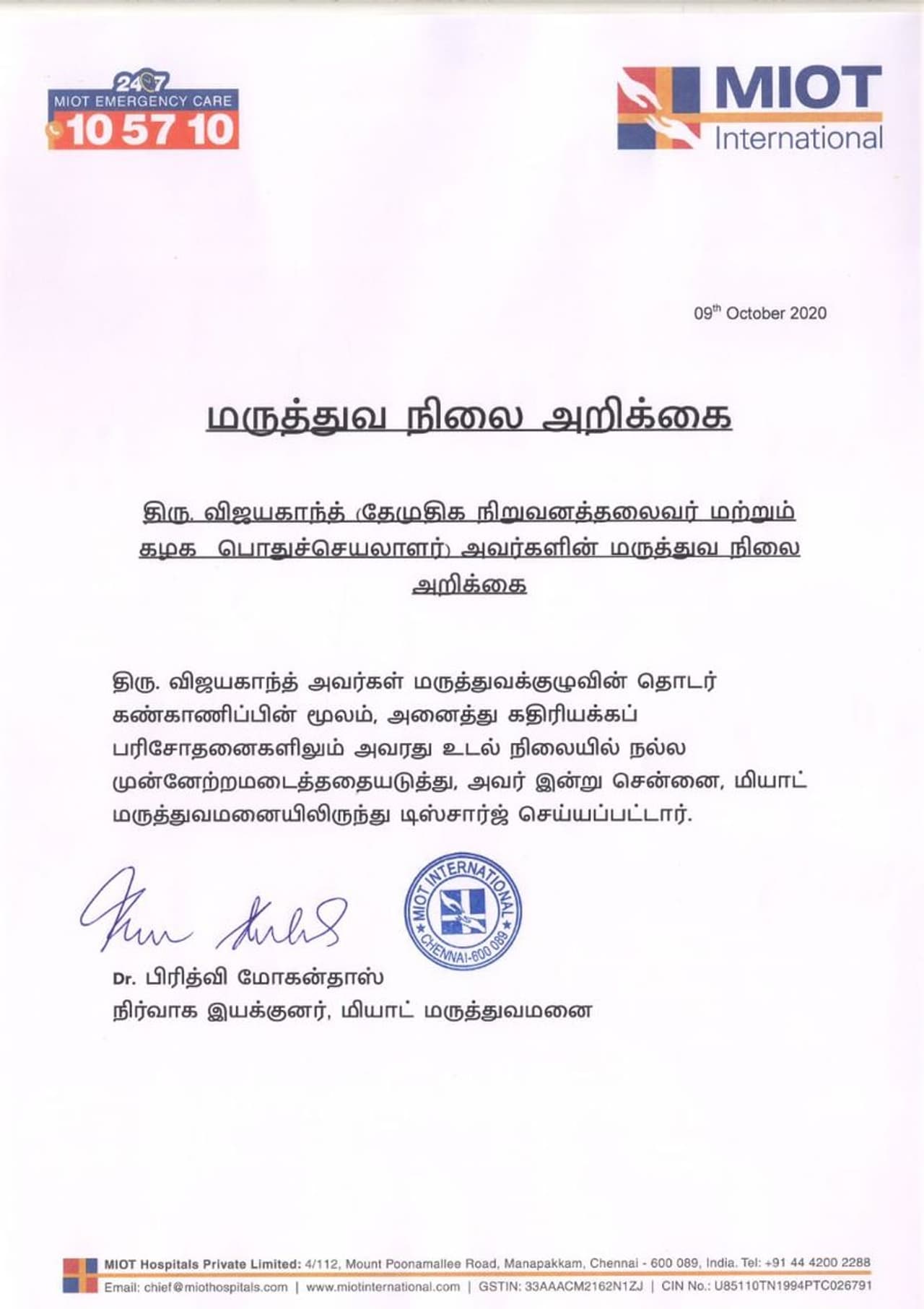 தே.மு.தி.க. தலைவர் விஜயகாந்த்துக்கு கடந்த மாதம் செப்டம்பர் 22 ஆம் தேதி கொரோனா தொற்று இருப்பது கண்டுபிடிக்கப்பட்டது. இதை தொடர்ந்து அவர் மடிப்பாக்கத்தில் உள்ள, தனியார் மருத்துவமனையில் 24 ஆம் தேதி சிகிச்சைக்காக அனுமதிக்கப்பட்டார்.