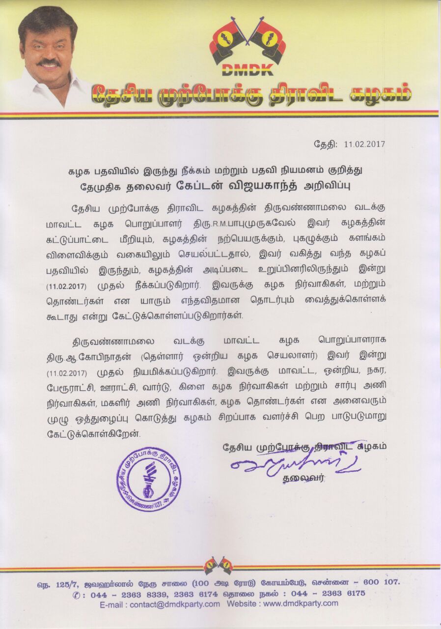இதையடுத்து கழகத்தின் கட்டுபாட்டை மீறியதாகவும், கட்சிக்கு களங்கம் விளைவிக்கும் வகையில் செயல்பட்டதாகவும் கூறி கழக பதவியில் இருந்து நீக்குவதாக தேமுதிக தலைவர் விஜயகாந்த் அறிவித்துள்ளார்.