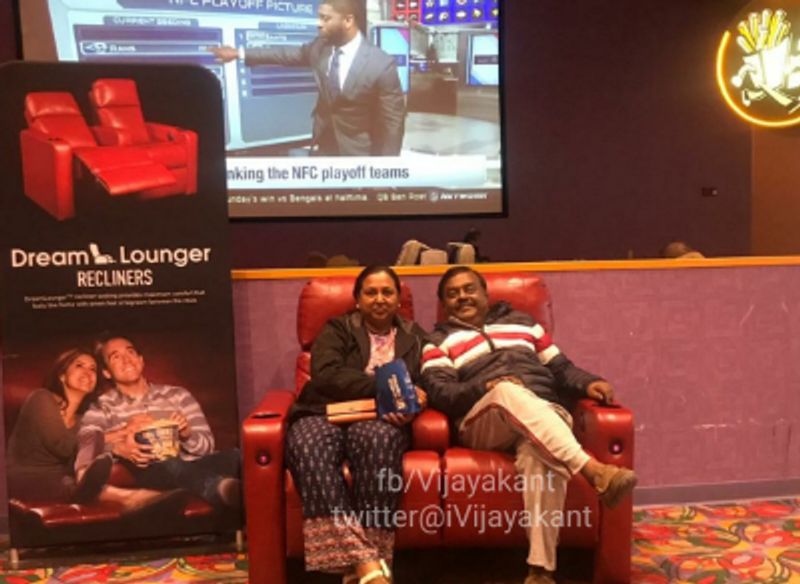 நடிகரும் தேமுதிக கட்சியின் பொதுச்செயலாளருமான, கேப்டன் விஜயகாந்த் உடல்நிலையில் நல்ல முன்னேற்றம் ஏற்பட்டுள்ளதால், அவர் மனைவி பிரேமலதாவுடன் சென்று ஐமேக்ஸ் தியேட்டரில் திரைப்படம் பார்த்த போது எடுக்கப்பட்ட புகைப்படம் ஒன்றை வெளியிட்டுள்ளார். இது கட்சி தொண்டர்கள் மற்றும் ரசிகர்களை நிம்மதியடைய செய்துள்ளது.