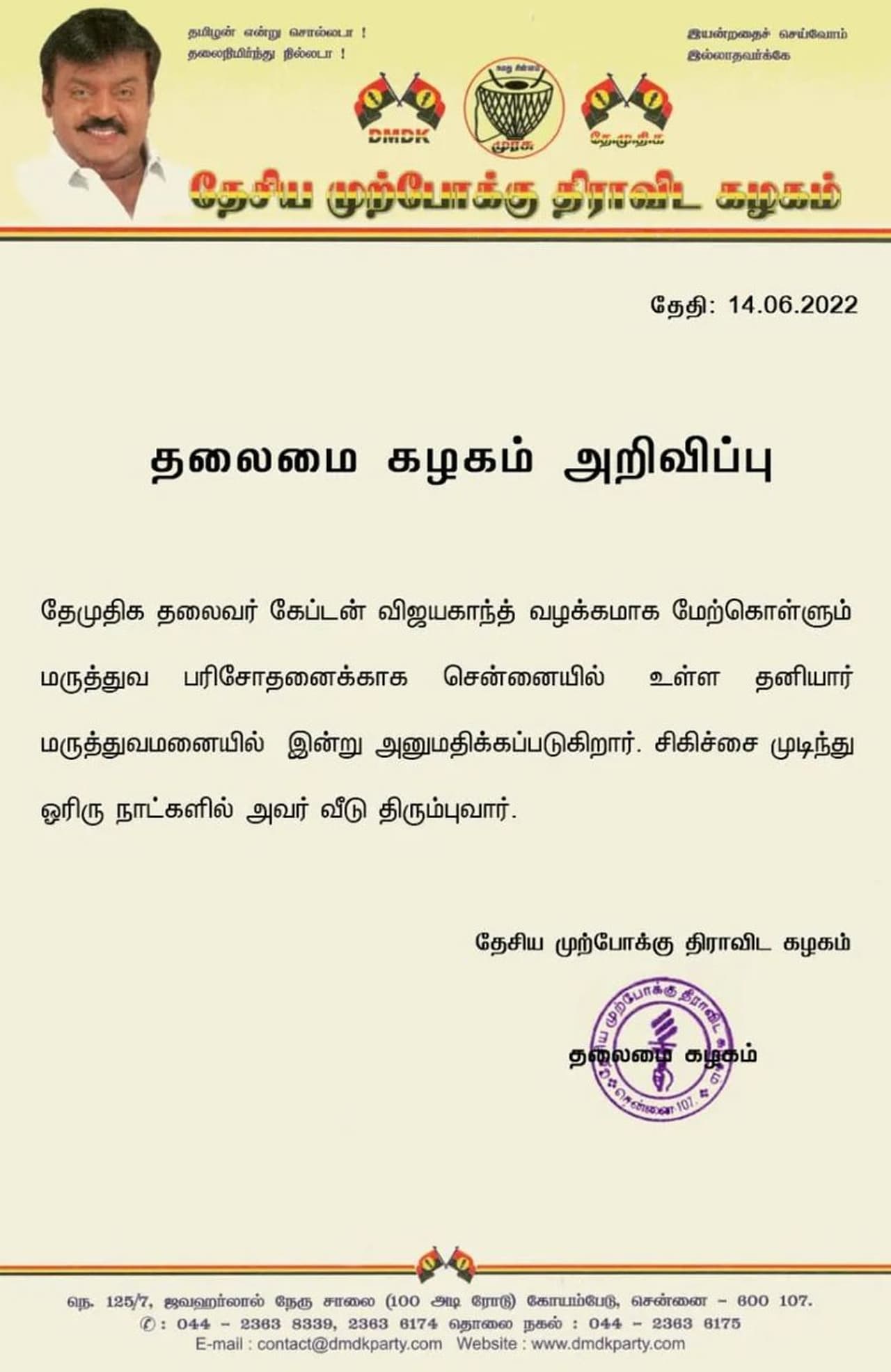 தேமுதிக தலைவர் விஜயகாந்த் சென்னை நந்தம்பாக்கத்தில் உள்ள தனியார் மருத்துவமனையில் அனுமதிக்கப்பட்டுள்ள சம்பவம் பெரும் பரபரப்பை ஏற்படுத்தியுள்ளது. நடிகரும் தேமுதிக கட்சியின் தலைவராகவும் இருக்கும் விஜயகாந்த் உடல் நலக்குறைவால் தீவிர அரசியலில் இருந்து விலகி இருக்கிறார். கட்சி நடவடிக்கைகளை அவரின் குடும்பத்தினர் கவனித்துக்கொள்கிறார்கள். நடந்து முடிந்த சட்டப்பேரவைத் தேர்தலில்கூட அவர் போட்டியிடவில்லை. விஜயகாந்த் தனது குடும்பத்தினருடன் இருக்கும் புகைப்படங்கள் மட்டுமே அவ்வப்போது சமூக வலைதளத்தில் பதிவிடப்பட்டு வருகிறது. இந்த நிலையில் விஜயகாந்த் தற்போது மருத்துவமனையில் அனுமதிக்கப்பட்டுள்ளார்.
