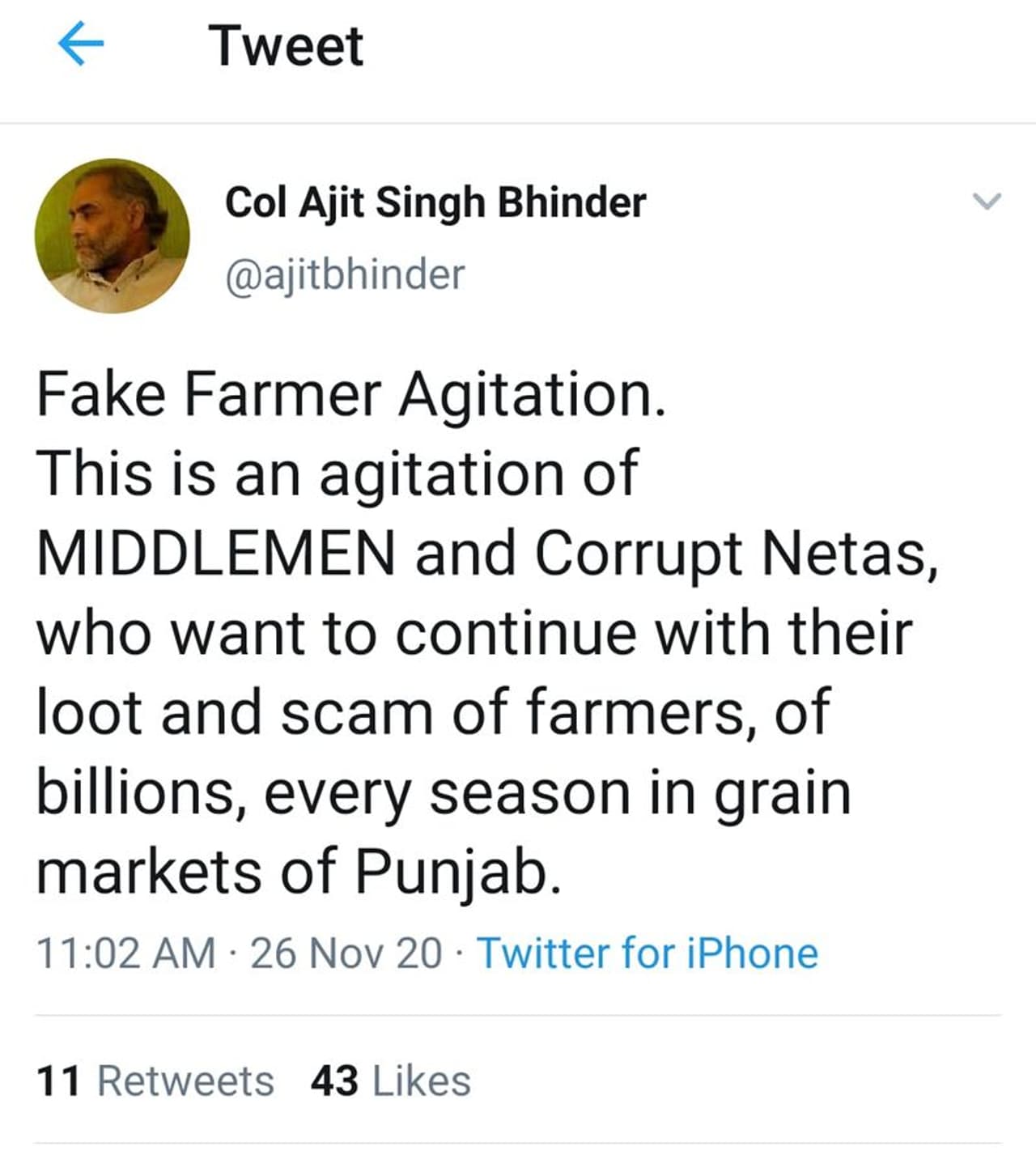 இந்த மசோதாவை ஒட்டுமொத்த நாடும் வரவேற்கிறது, எனவும் ஆனால் இதுபோலி விவசாயிகள் இயக்கம், பஞ்சாபின் தானிய மண்டலங்களில் ஒவ்வொரு பருவத்திலும் பில்லியன் கணக்கான விவசாயிகளை கொள்ளையடித்துக் மோசடி செய்யும் இடைத்தரகர்கள் மற்றும் ஊழல்வாதிகள் நடத்தும் இயக்கம் இது என கடுமையாக விமர்சித்துள்ளனர்.