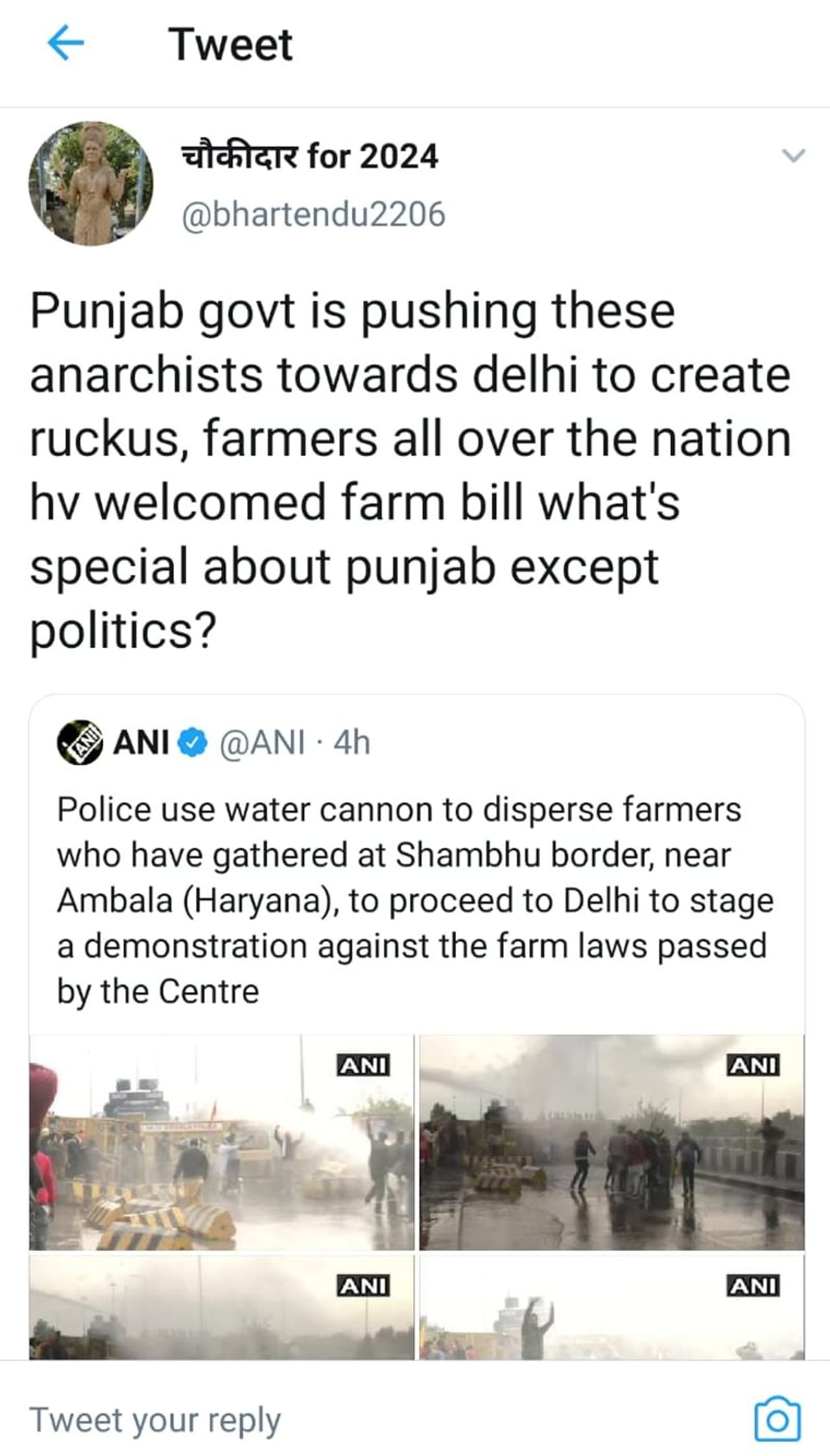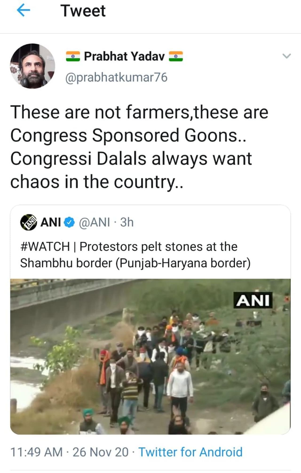 மத்திய அரசின் வேளாண் சட்டத்துக்கு எதிராக ராஜஸ்தான் மற்றும் பஞ்சாப் மாநில விவசாயிகள் டெல்லியை நோக்கி அணிவகுத்துச் செல்ல முயன்றபோது ஹரியானா எல்லையில் போலீசாருக்கும் விவசாயிகளுக்கும் இடையே கடும் மோதல் ஏற்பட்டுள்ளது. பின்னர் இது வன்முறையாகவும் வெடித்துள்ளது. இந்நிலையில் இவர்கள் விவசாயிகள் அல்ல காங்கிரஸ் கட்சியால் அனுப்பப்பட்ட காங்கிரஸ் குண்டர்கள் என சமூகவலைதளத்தில் விமர்சிக்கபட்டு வருகிறது.