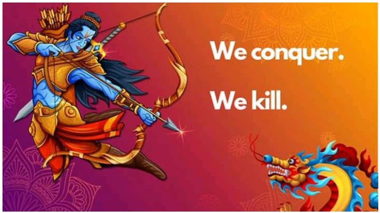 அந்தப்படத்தில், "நாங்கள் வெல்வோம், உங்களை அழிப்போம்" என்ற தலைப்பில் சீனாவின் ட்ராகனுடன் இந்து கடவுளான ஸ்ரீ ராமர் சண்டை போடுவது போன்று வடிவமைக்கப்பட்டுள்ளது.