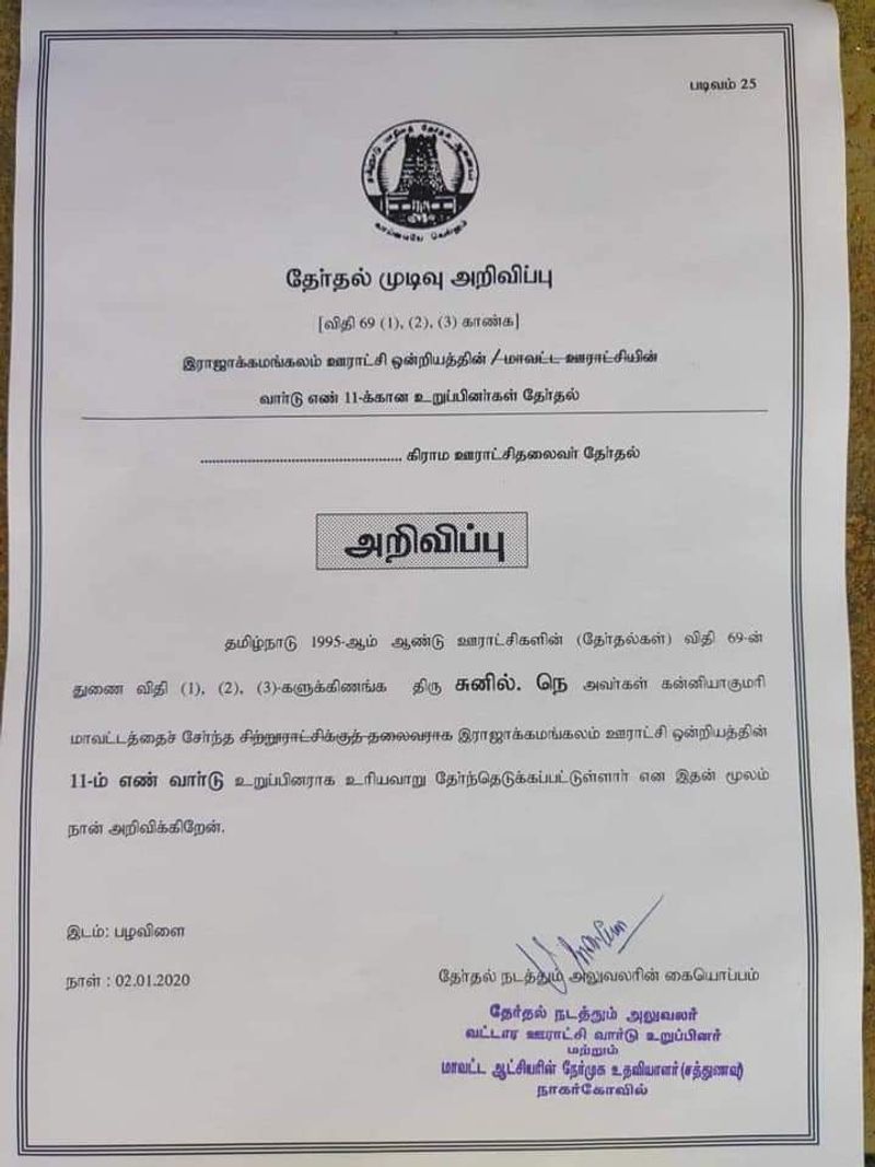 சட்டமன்ற, நாடாளுமன்ற தேர்தல்களை சந்தித்த போதும் கணிசமான வாக்குகளை பெற்ற நாம் தமிழர் கட்சி வேட்பாளர்கள் இதுவரை வெற்றிபெற்றதே இல்லை. கடந்த மக்களவை தேர்தலில் கணிசமான வாக்குகளை பெற்றதால் நாம் தமிழர் கட்சி உள்ளாட்சி தேர்தலில் குறிப்பிடும் அளவிற்கு வெற்றி பெறும் என எதிர்பார்க்கப்பட்டது. ஆனால், ஒரே ஒரு கவுன்சிலர் சீட்டை மட்டுமே பிடித்தது. நாம் தமிழர் கட்சியை சேர்ந்த குமரி மாவட்டம், ராஜாக்கமங்கலம் ஒன்றிய 11 வது வார்டில் சுனில் வெற்றி பெற்றுள்ளார். இந்த வெற்றி அக்கட்சியினருக்கு பெரும் உற்சாகத்தைக் கொடுத்துள்ளது.